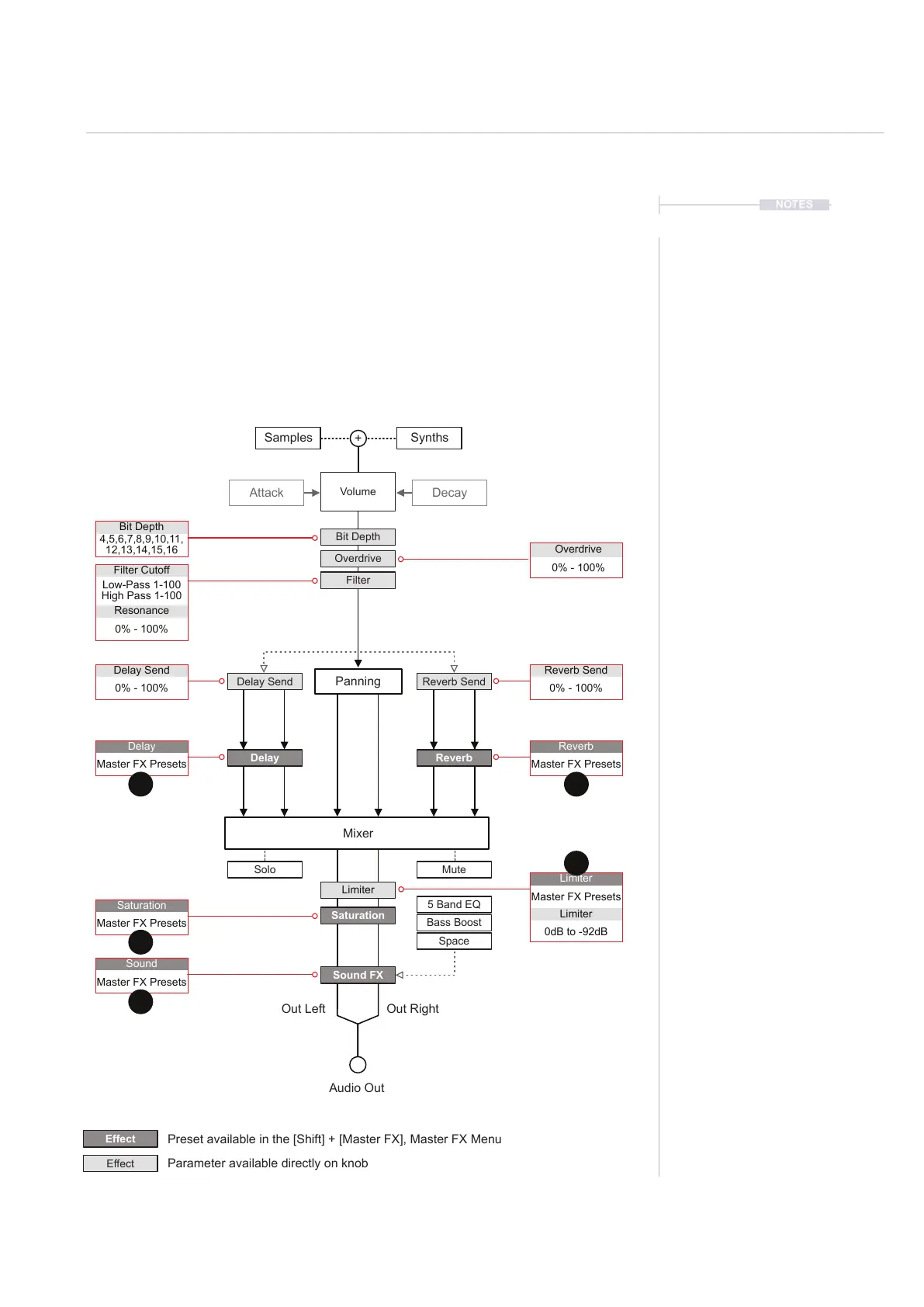 FX and Saturation enhance the main output, while Delay and Reverb can