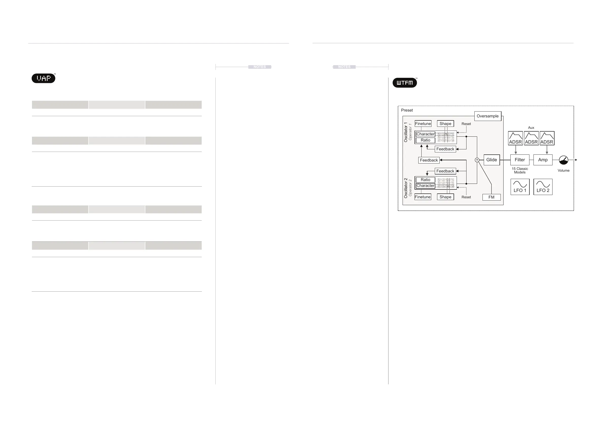 uses integrated wavetables as its oscillators. The 2-operator FM