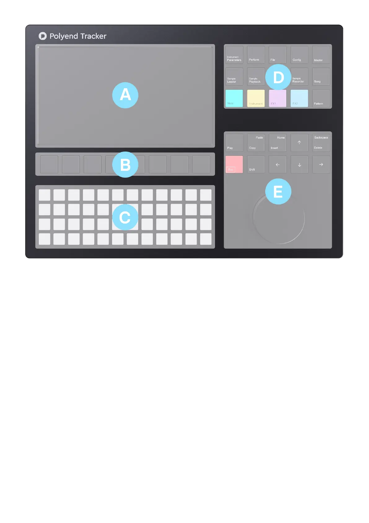 The Polyend Tracker user interface is divided into five sections: