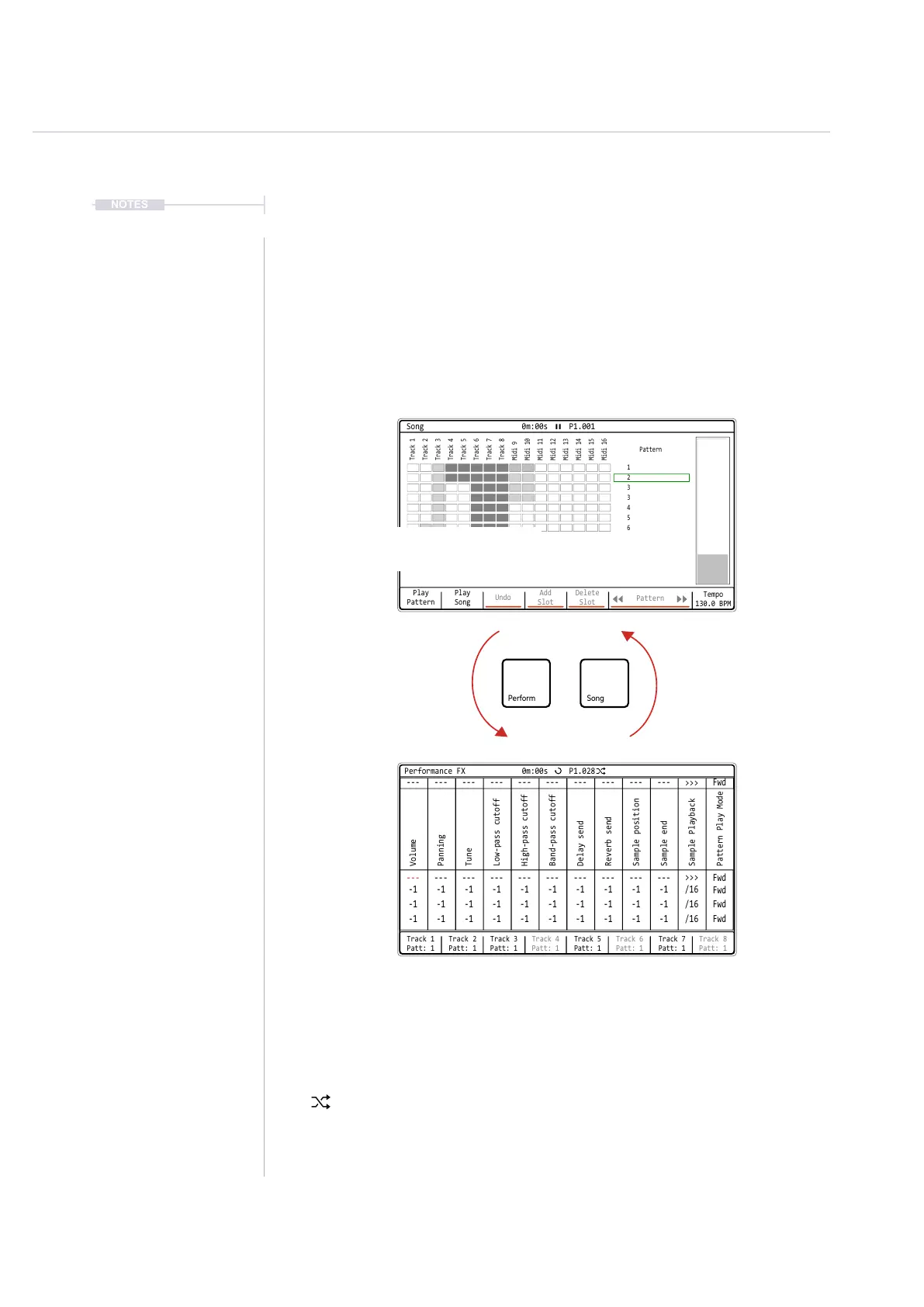 Press [Play] in Performance Mode to play the current pattern as set in the pattern page or set