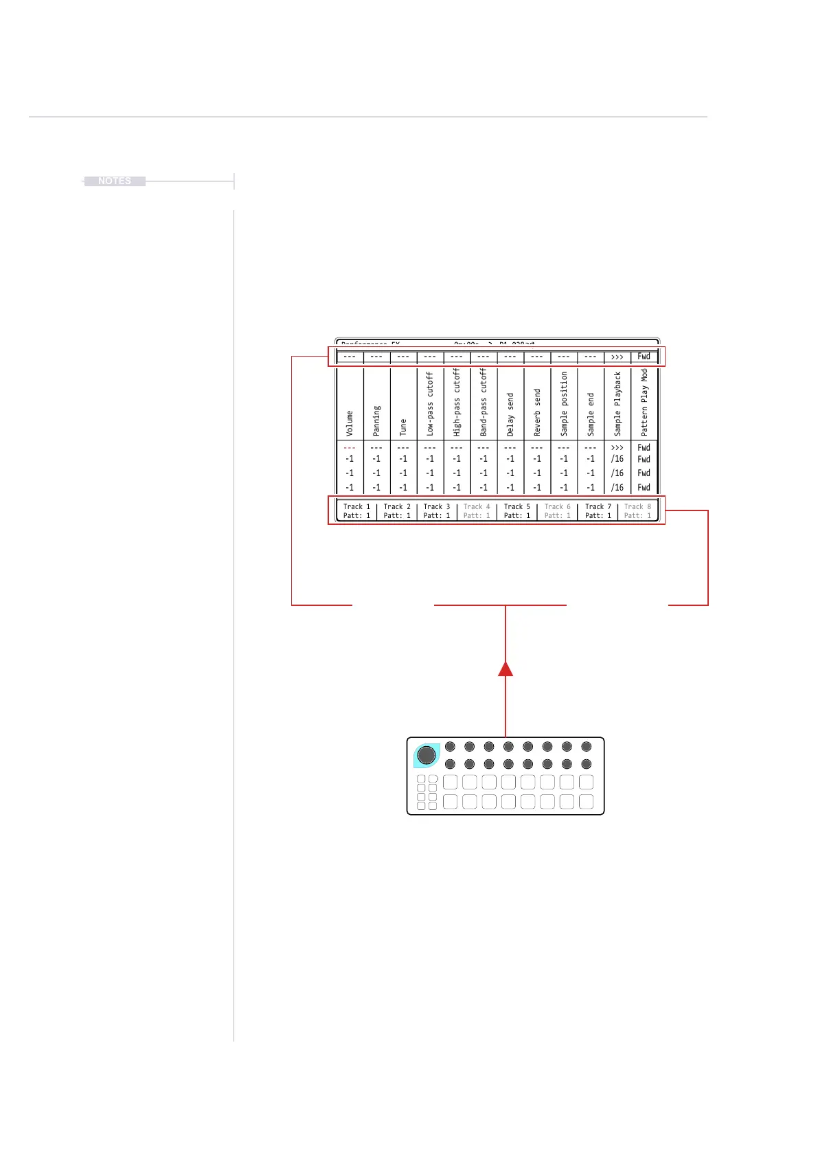 effect slots and the 8 track selections. The top row of the performance