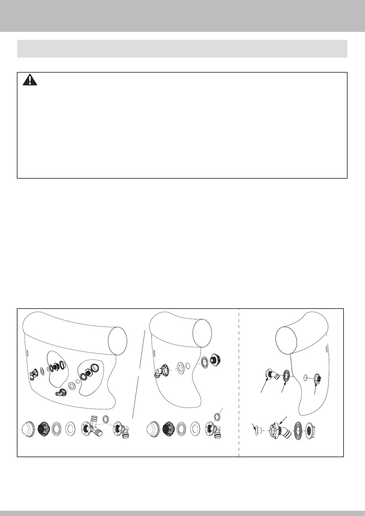 Veuillez noter : le joint de caoutchouc noir (joint de raccord) doit toujours être placé par-dessus le raccord de succion ou de retour d’eau en plastique fileté et doit se