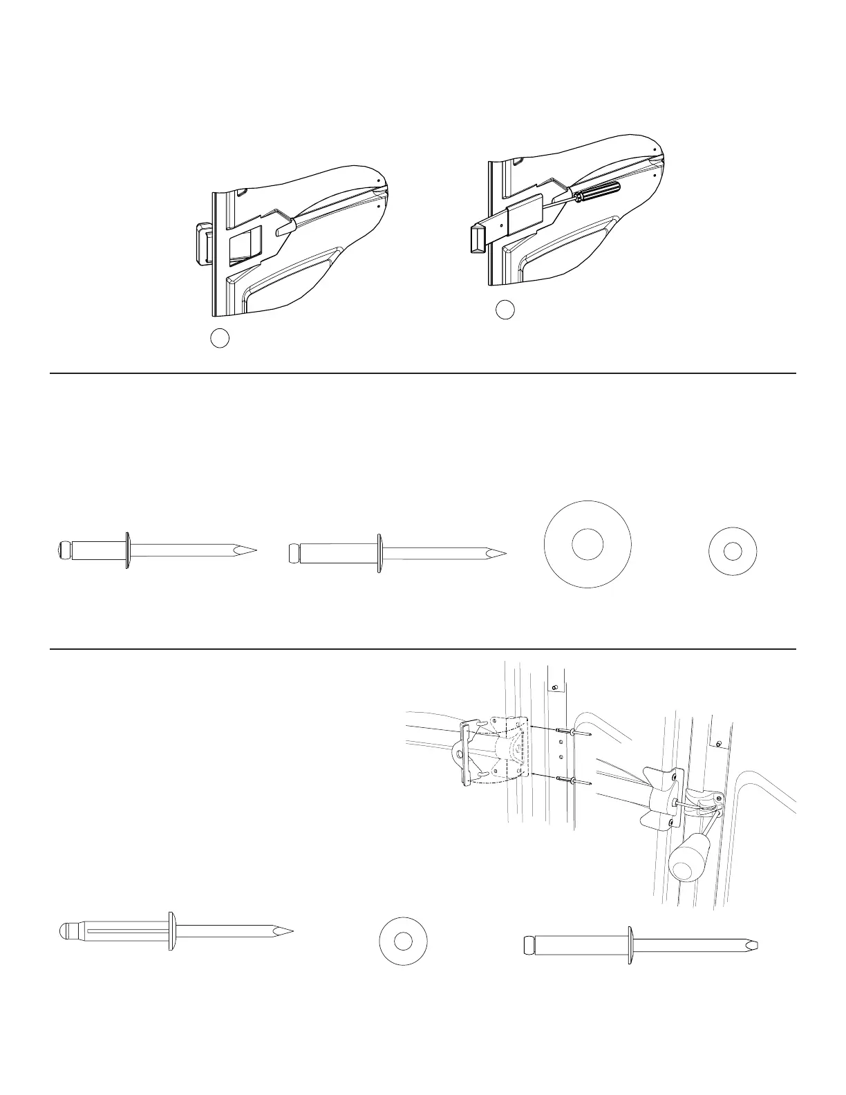 of the restroom. Align the two outer holes of the bracket with the two holes in the door, rivet in place with (2) PC-000102 rivets. Locate the hole at the top, in the middle of
