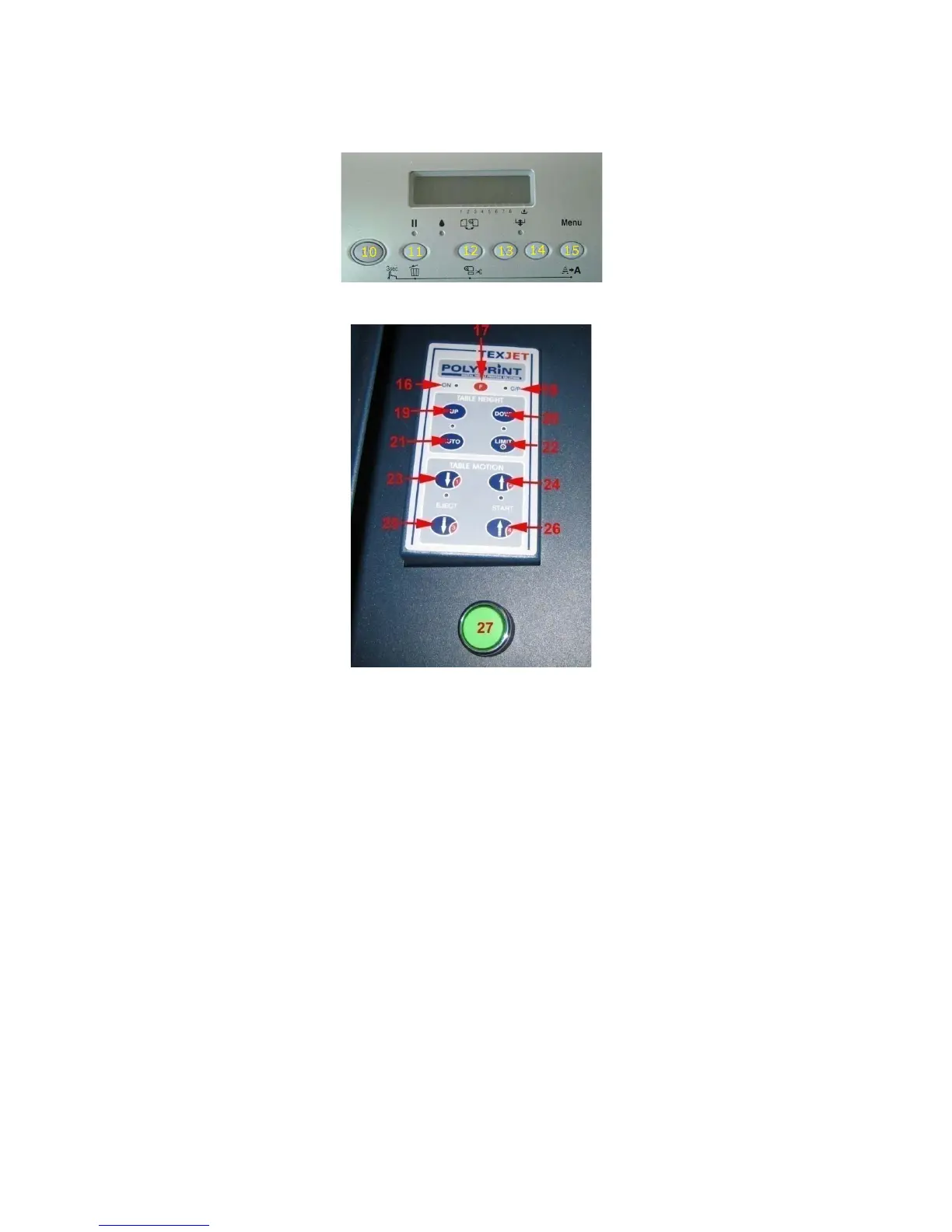 Polyprint TEXJET - Operating panels; Power On;Off Button; Pause Button; Automatic Plate Height Adjustment
