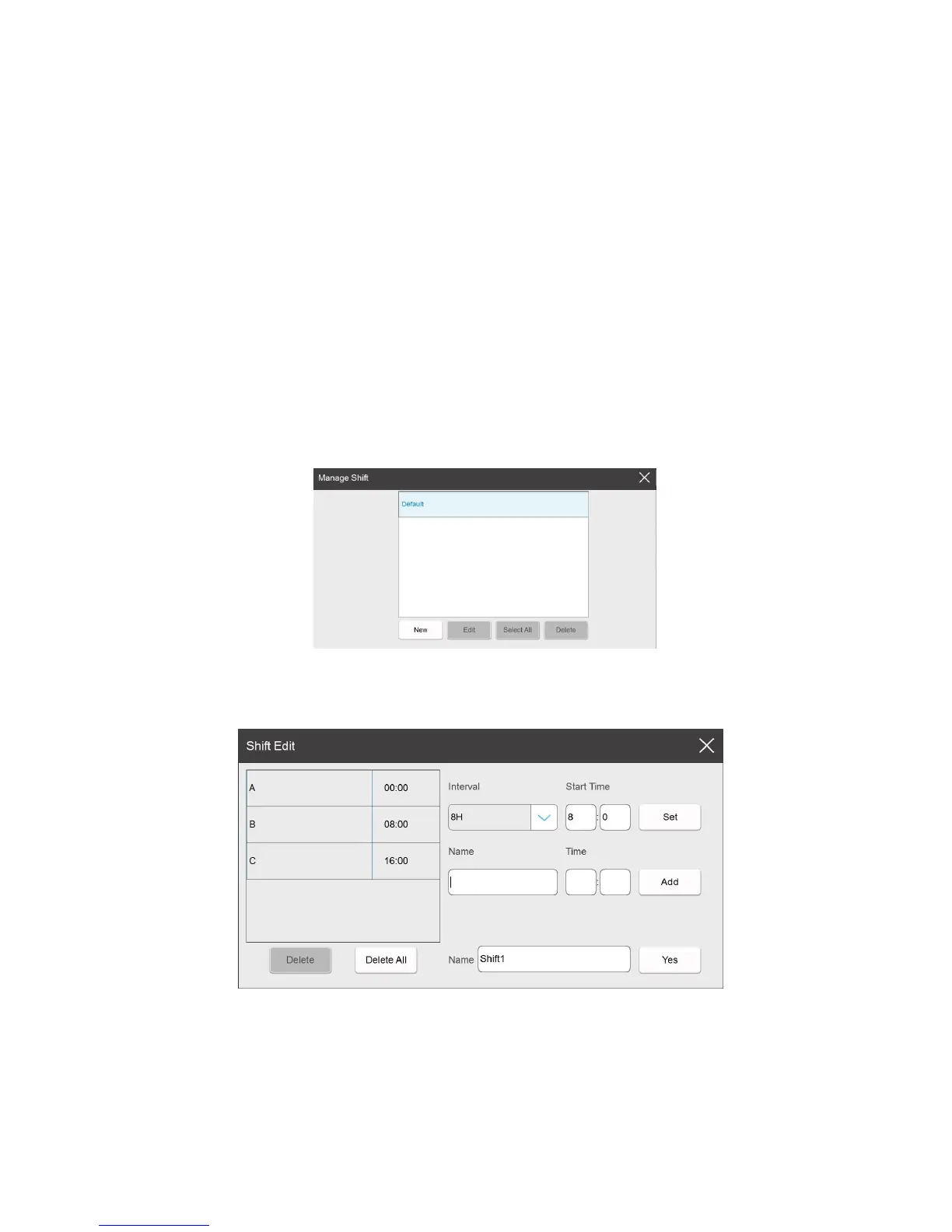 Shift: Click to switch shift, (default A:8:00 B:16:00 C:0:00), if you need to create a new one