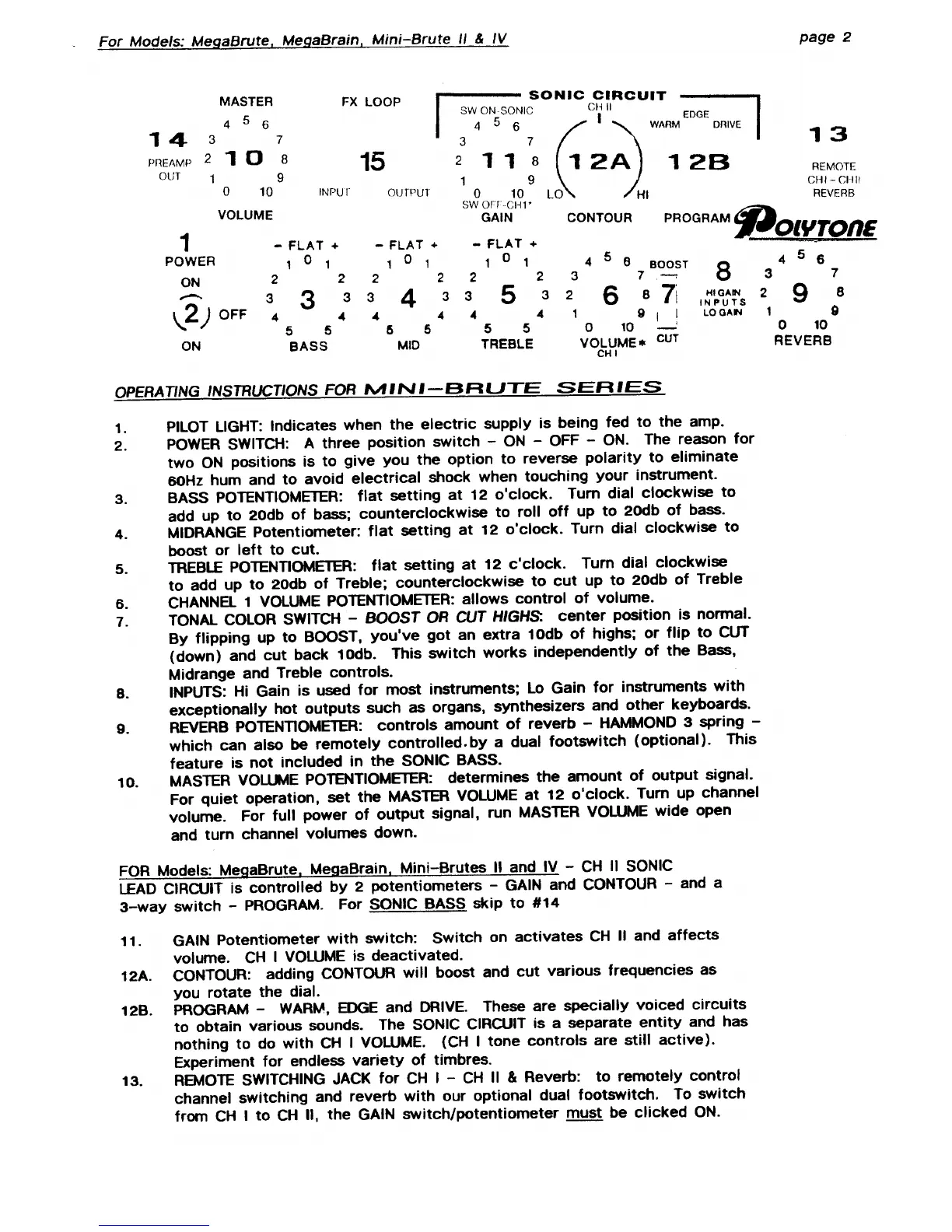 Polytone MegaBrute - Mini-Brute Series Operating Instructions; Pilot Light and Power Switch; Tone and Volume Controls; Input Jacks and Reverb