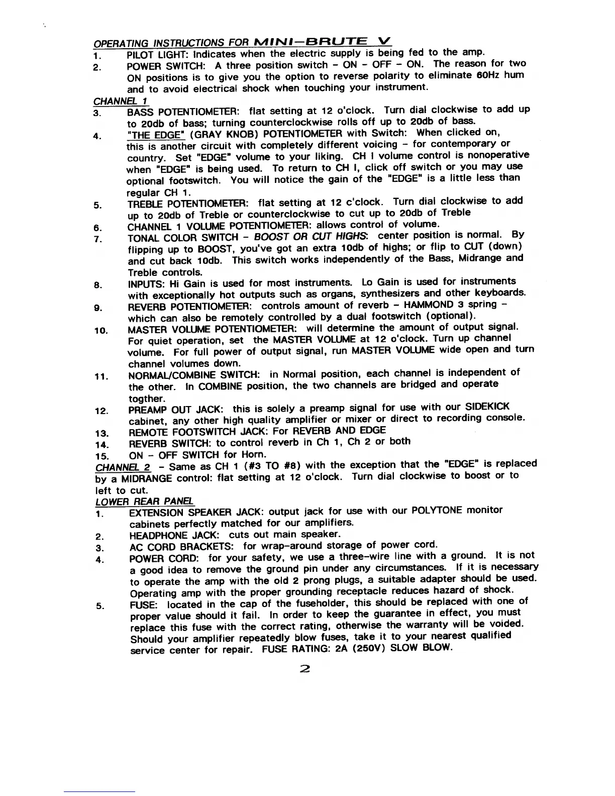 Polytone MINI-BRUTE V - Operating Instructions for Mini-Brute V; Pilot Light and Power Switch; Channel 1 Controls Overview; The Edge Control and Voicing