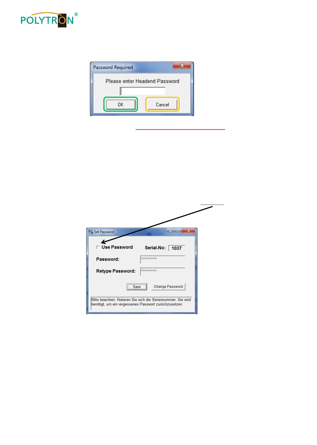 The generally password-reset can only be applied by POLYTRON, for this procedure you will get a new password to