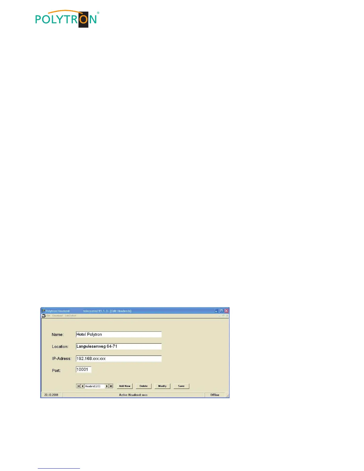 . Enter the name, place, IP address (or if applicable alias: www.___) and port of the headend (an existing headend