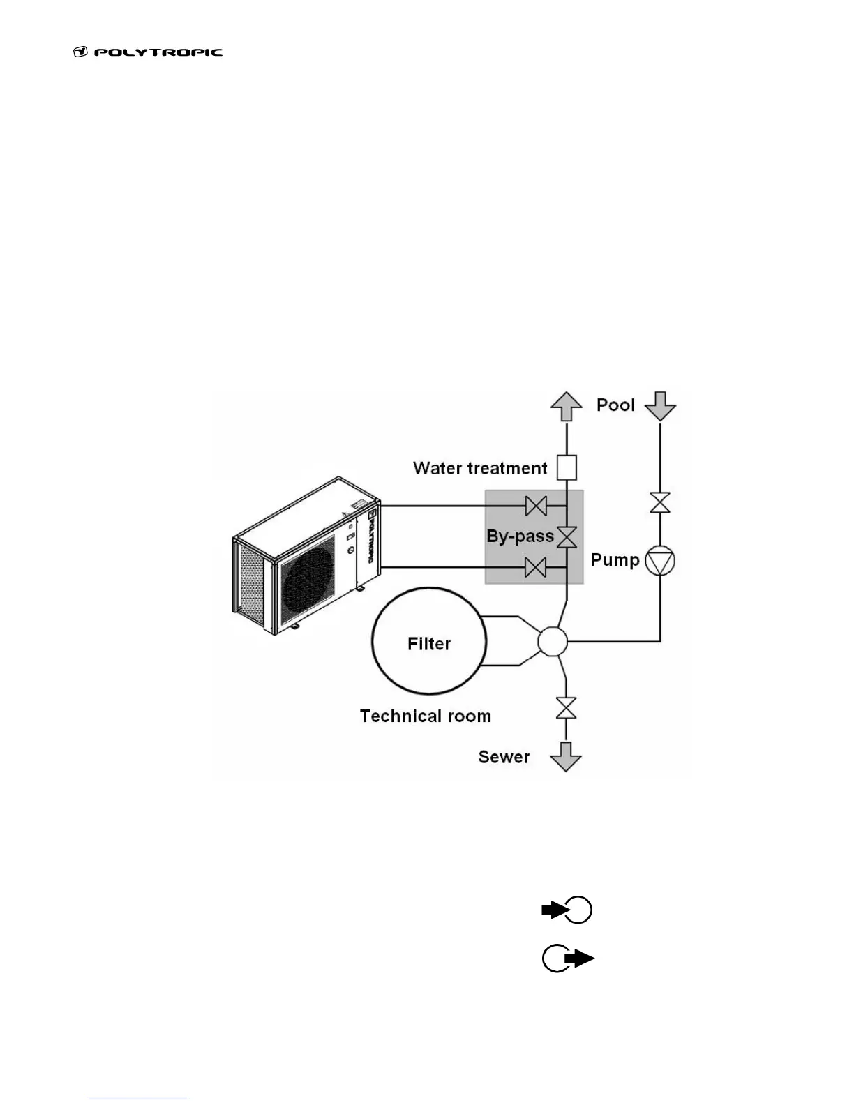 The heat pump should be connected to a filtration circuit trough a by-pass who consists of 3
