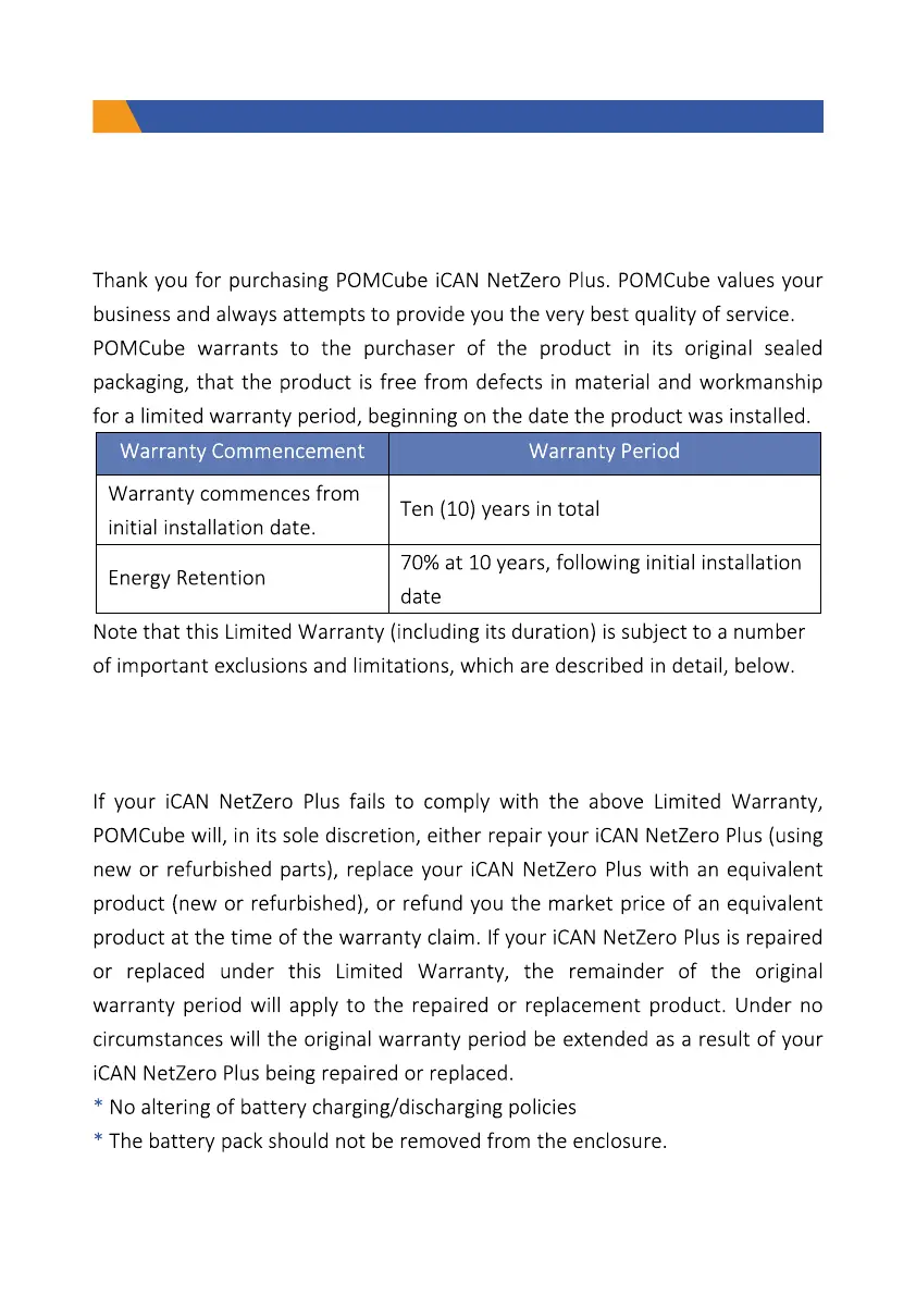 POMCube iCAN NetZero Plus - Warranty and Service; Limited Warranty; Remedies
