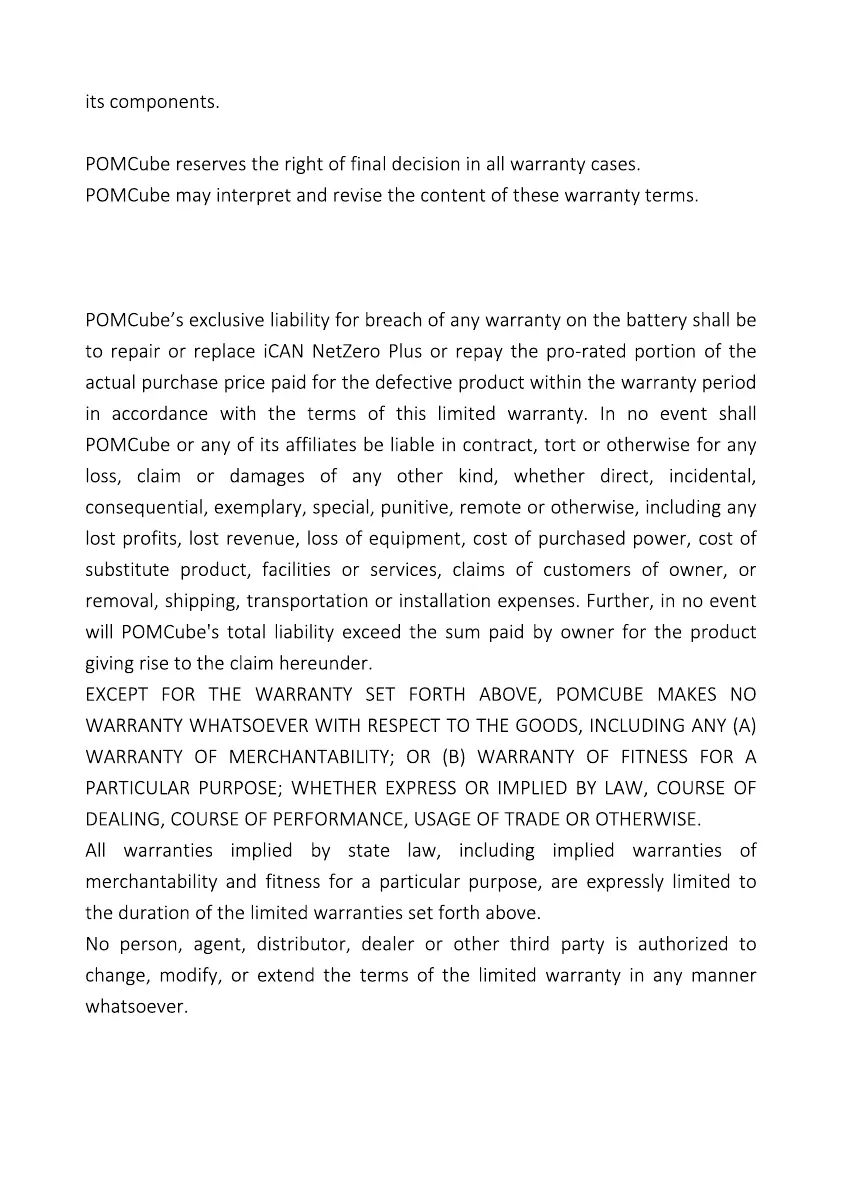 POMCube iCAN NetZero Plus - Warranty Disclaimer and Limita�On of Liability