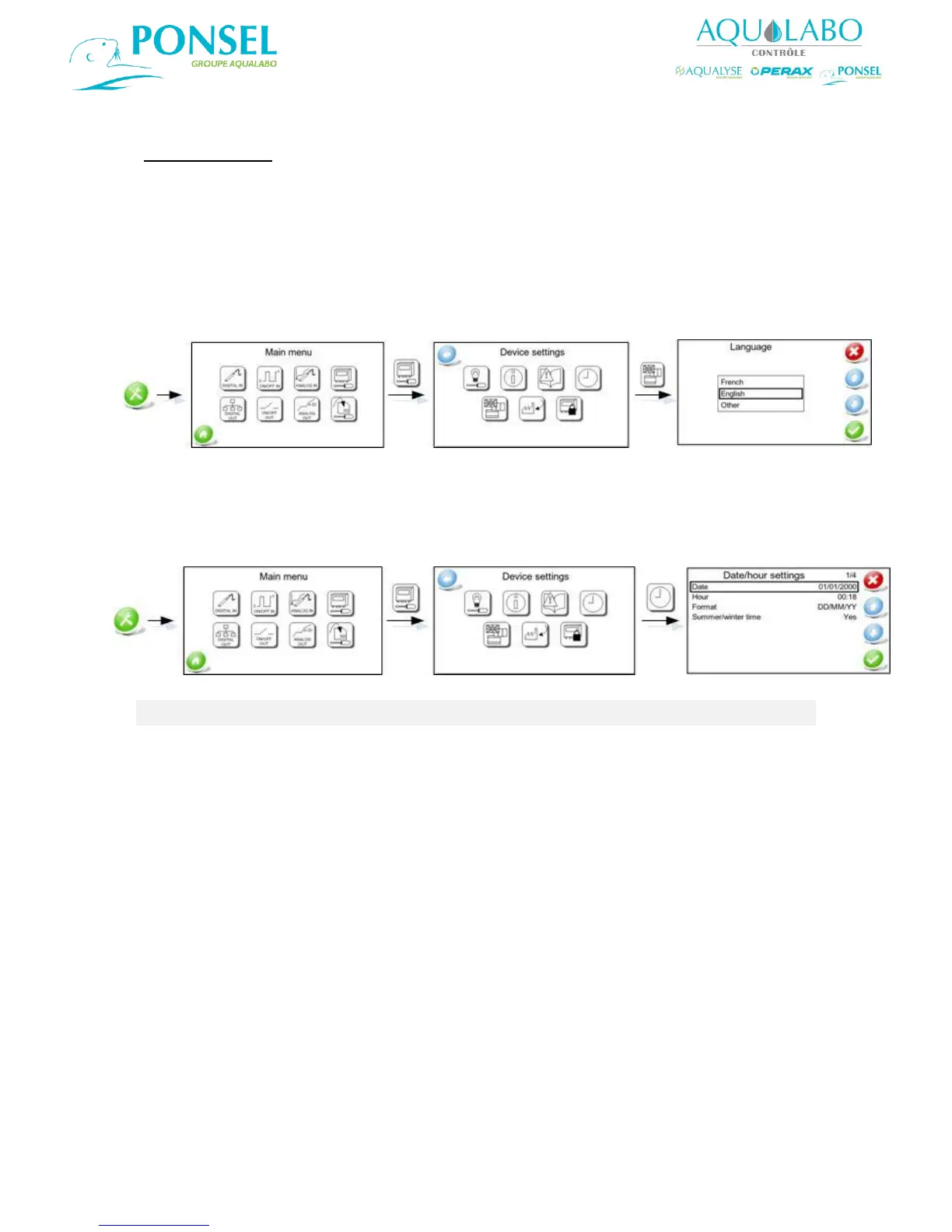 As an initial step, the operator can set the display language, the date format and the date and time.