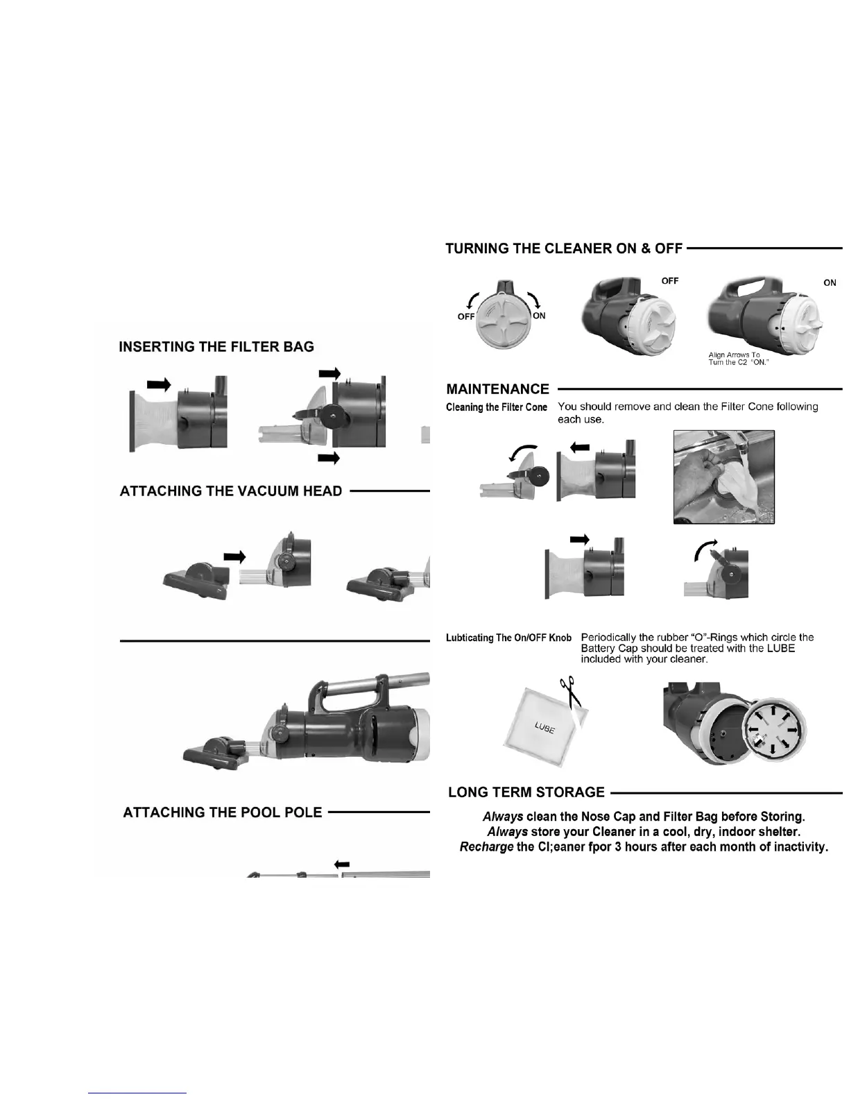 Pool Blaster iVac C2 - Operational Procedures; Filter Bag Installation; Vacuum Head Attachment; Cleaner On;Off Operation