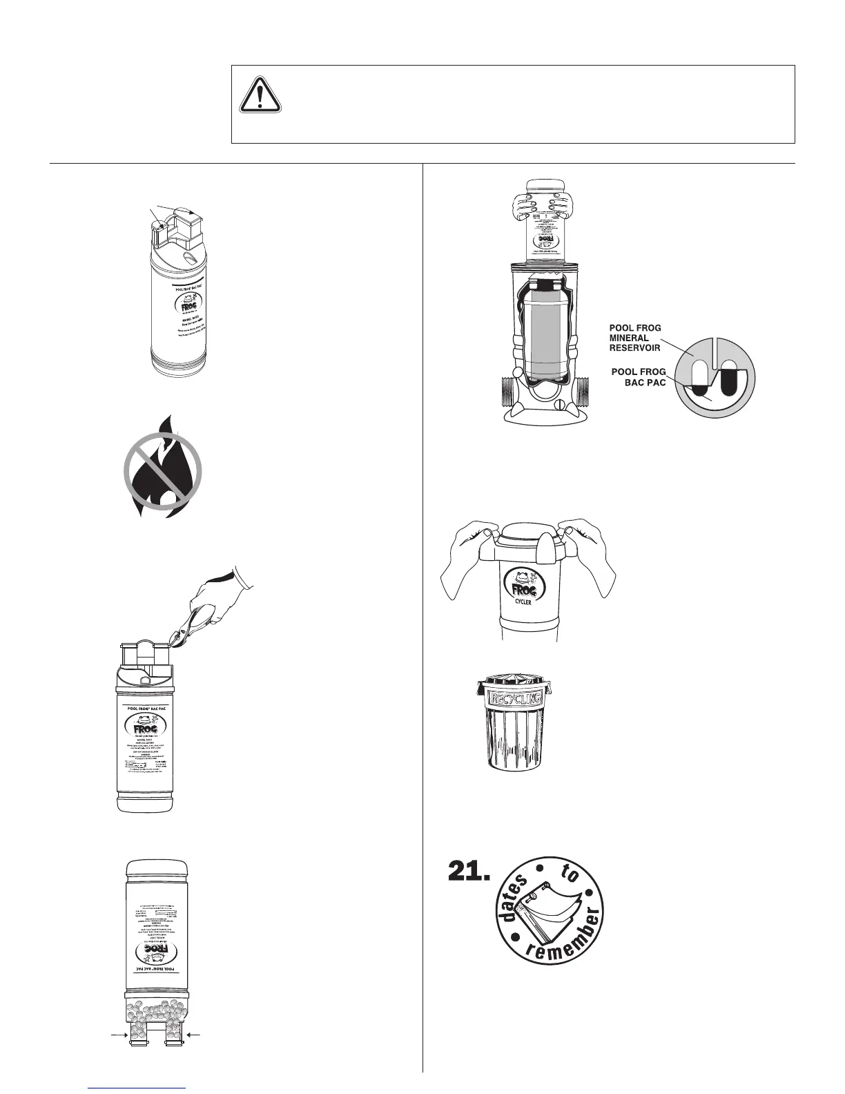 USE ONLY the factory recommended replacement POOL FROG® Bac Pac. (See label.)