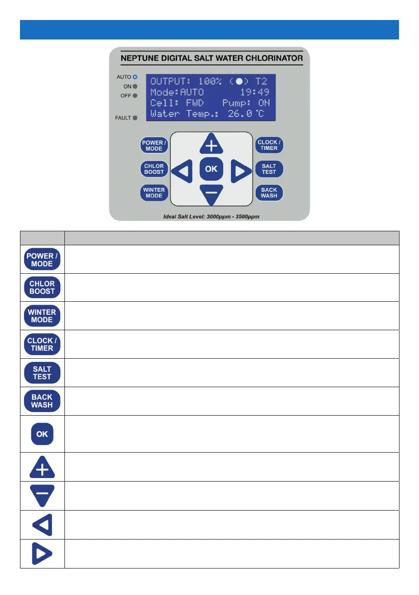 Sets the chlorinator’s operating mode between AUTO, ON and OFF.