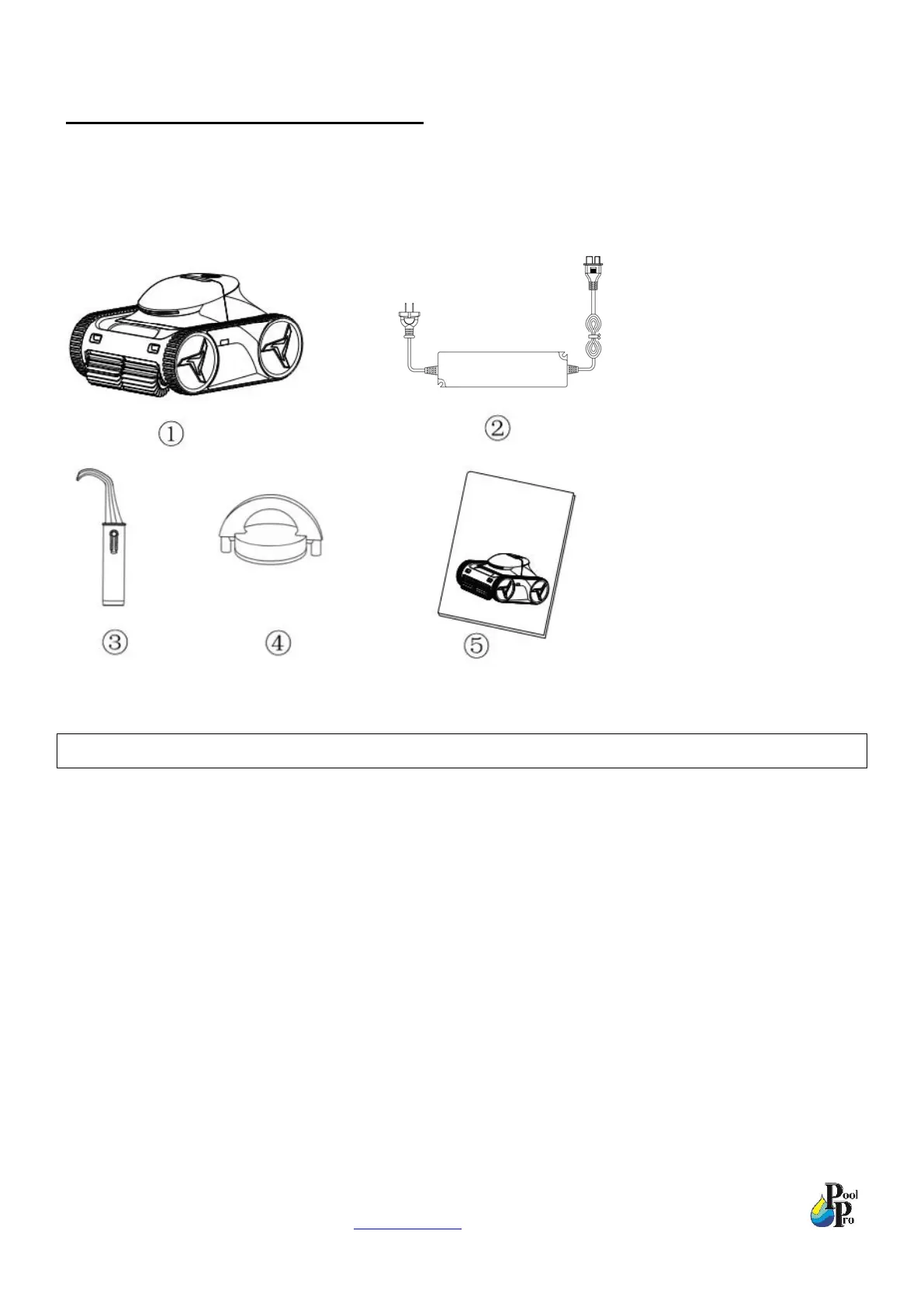 ① Robot cleaner ② Charger ③ Hook ④ Magnetic safety cap x 2 ⑤ User manual