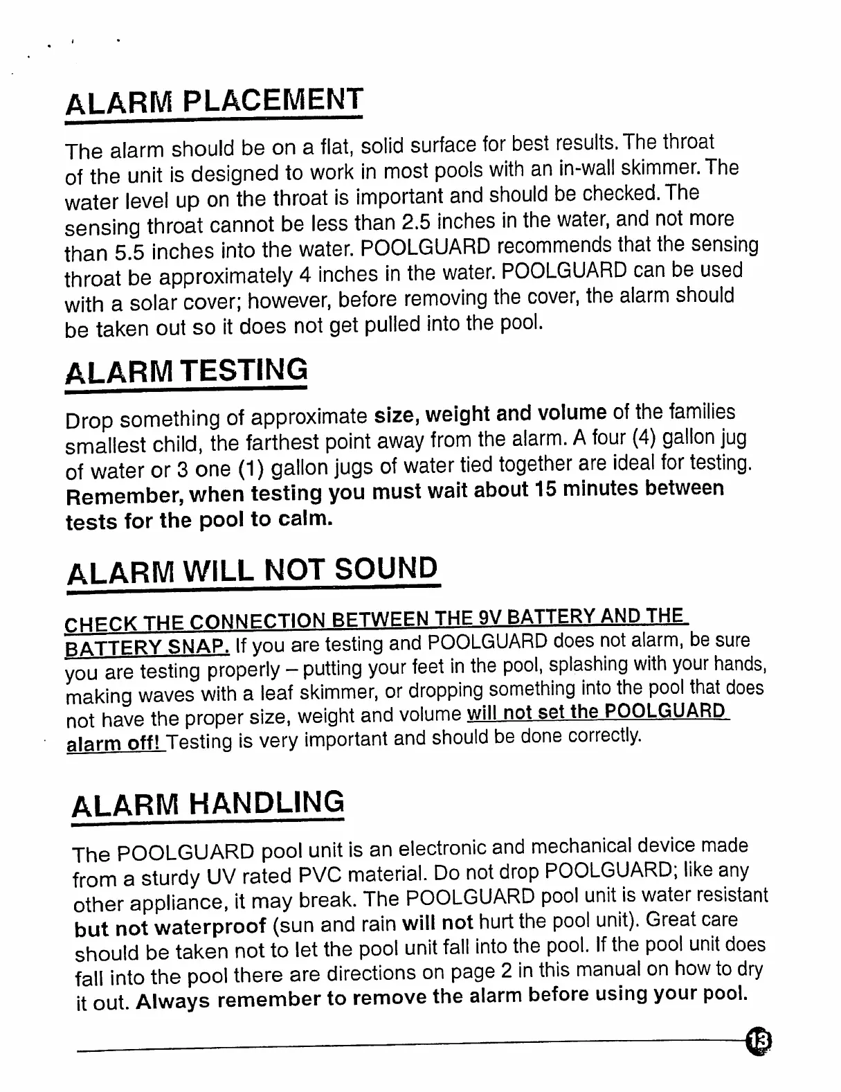 Poolguard PGRM - 2 - ALARM PLACEMENT; ALARM TESTING; ALARM WILL NOT SOUND; ALARM HANDLING