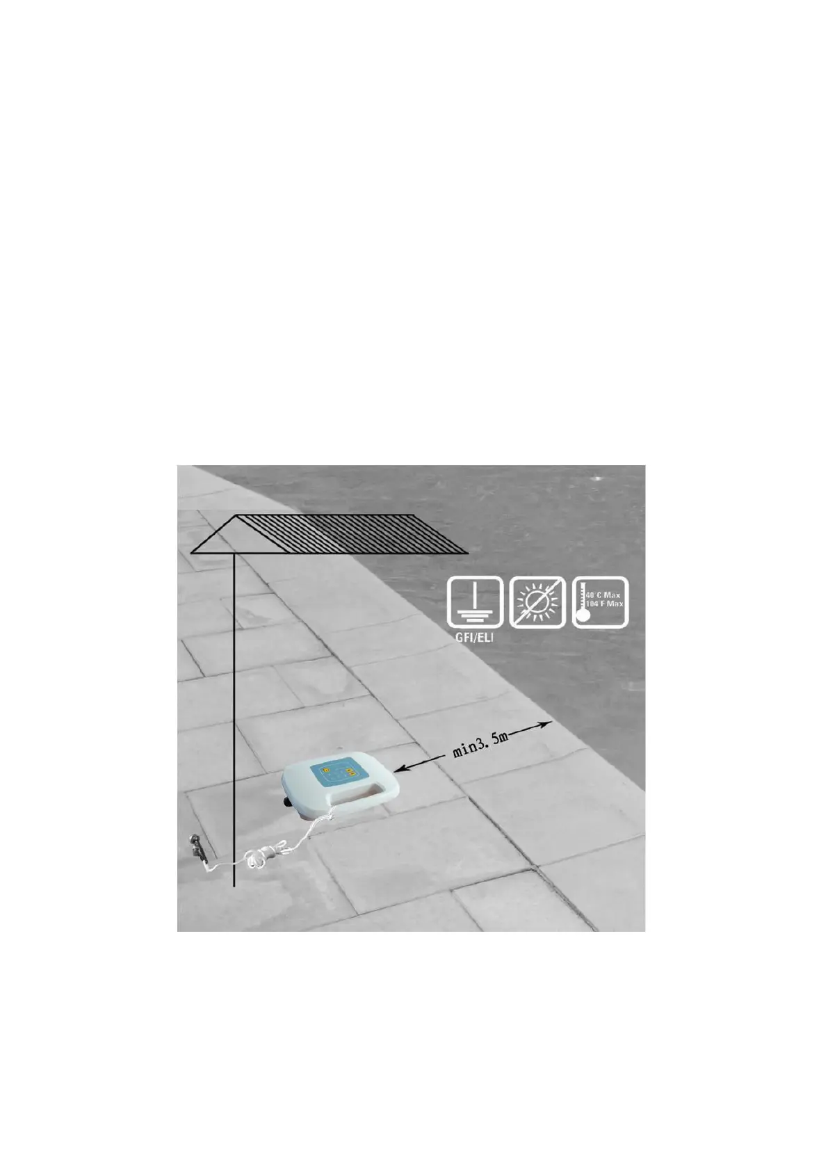 Strömförsörjningen ska vara placerad på ett lämpligt ställe så att hela poolens yta kan nås, och på