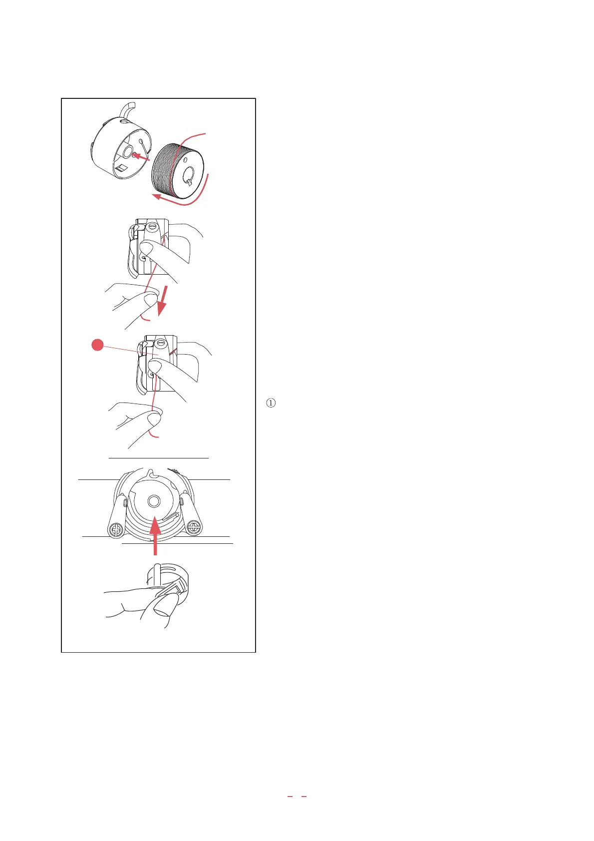 1. Hold the bobbin in your right hand with the thread running