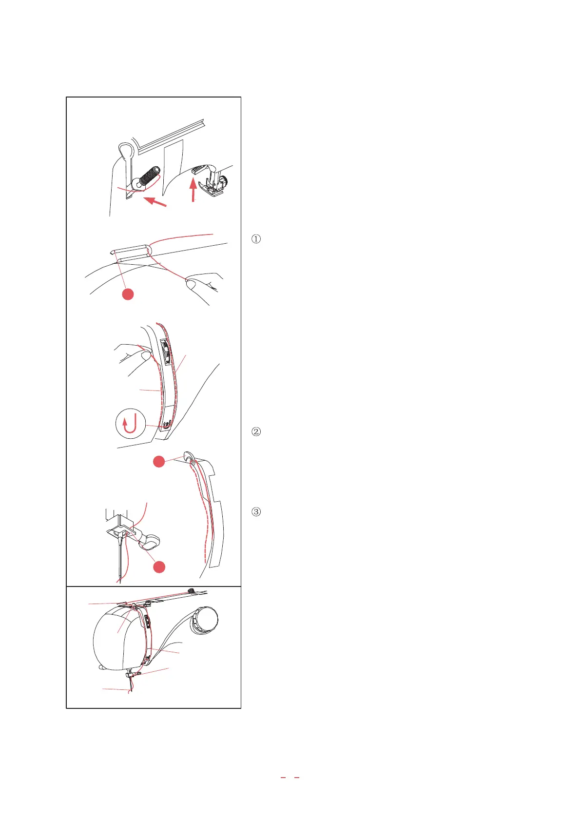 4. From right leftwards pull the top thread through take-up lever,