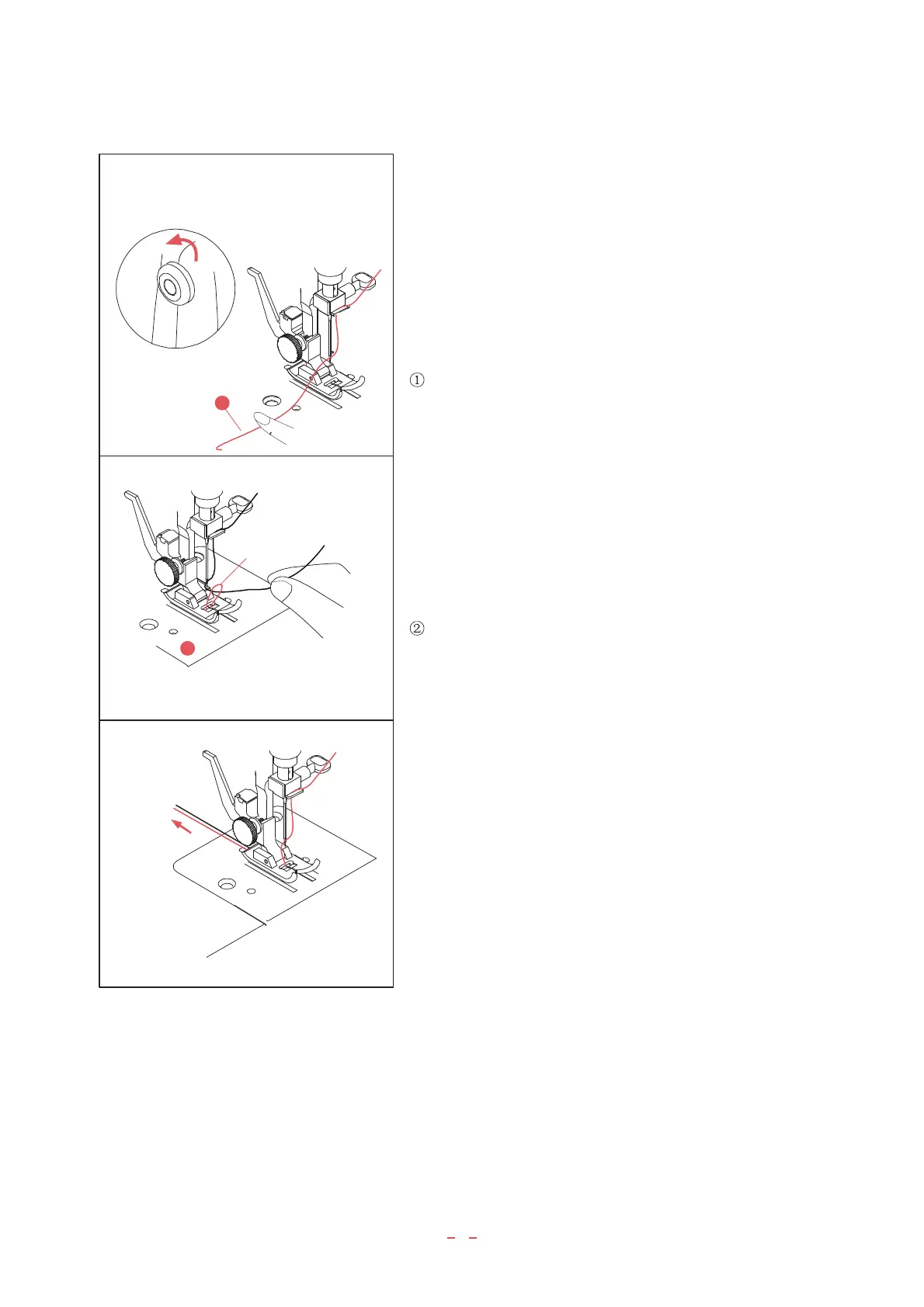 3. Pull both top and bobbin threads together towards back of