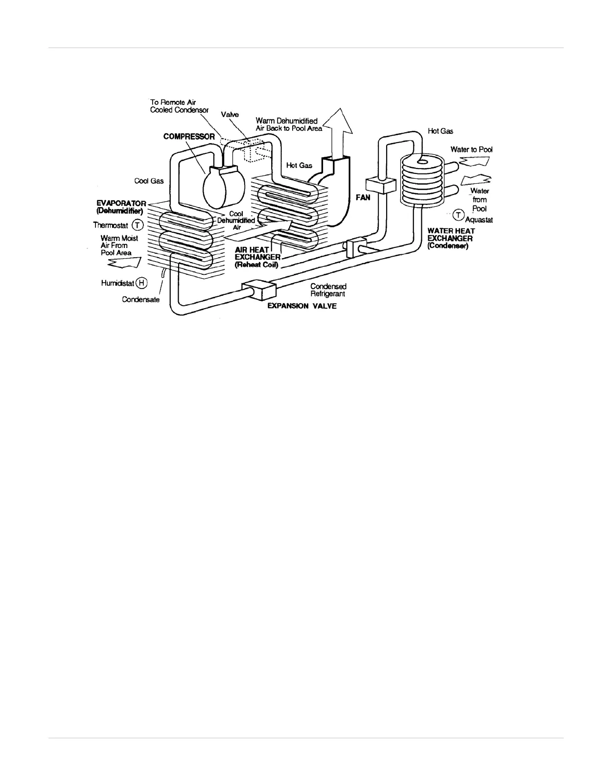 If pool water heating is required (AWH models only), the hot gas flows into a pool water condenser, where
