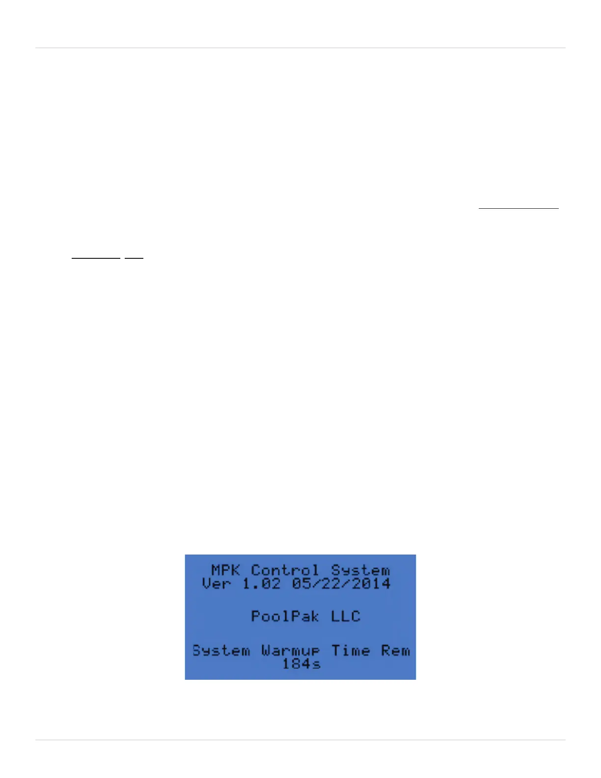 Upon startup, the screen shows the above indicating software version, date, and system warmup time remaining