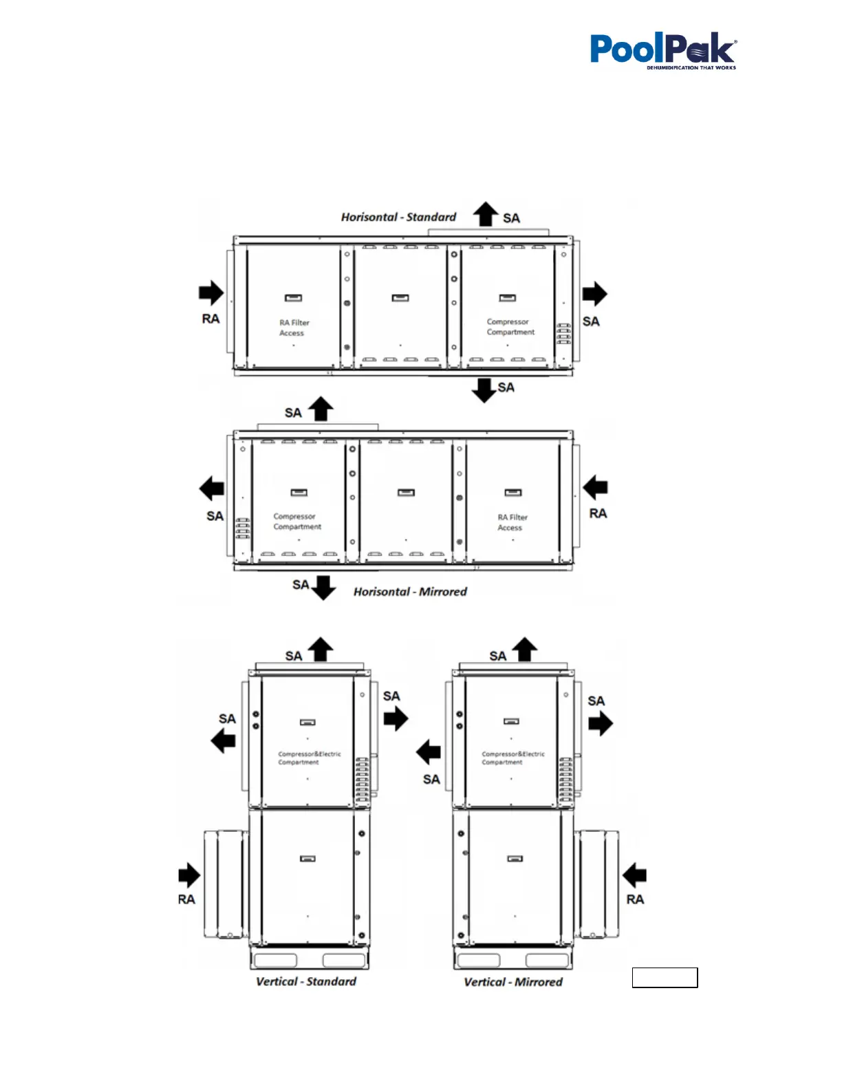 Both, horizontal and vertical, dehumidifier could have standard and mirrored cabinet arrangement (see Pic.C.2).