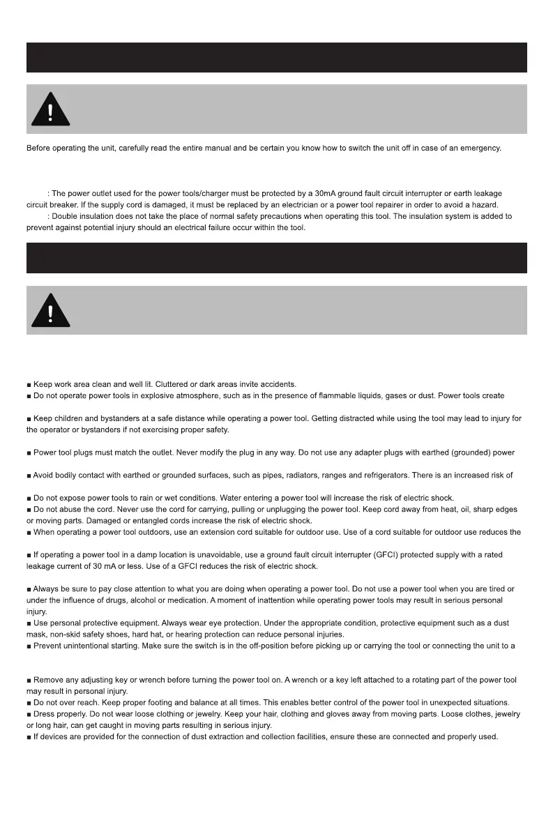 power source/battery pack. Carrying power tools with your finger on the switch or energizing power tools that have the switch on may lead to