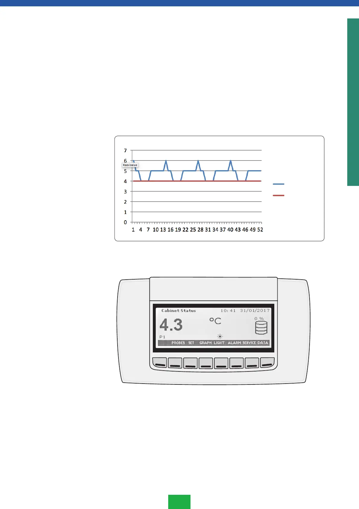 vastaa tyypillisen säilytettävän tuotteen lämpötilakäyttäytymistä. Näytöllä näkyvän anturin