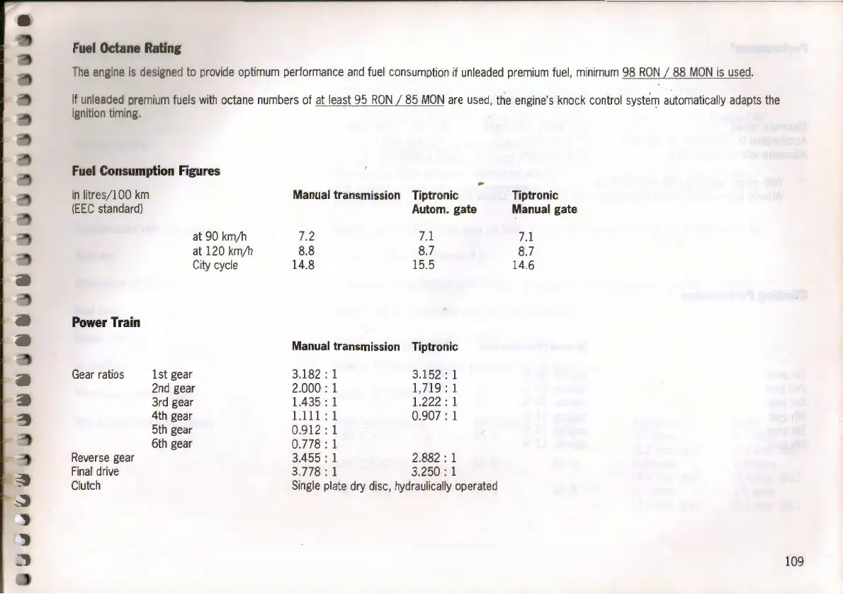 Porsche 968 - Technical Data: Fuel and Power Train; Fuel Octane Rating Requirements; Fuel Consumption Figures; Power Train Gear Ratios
