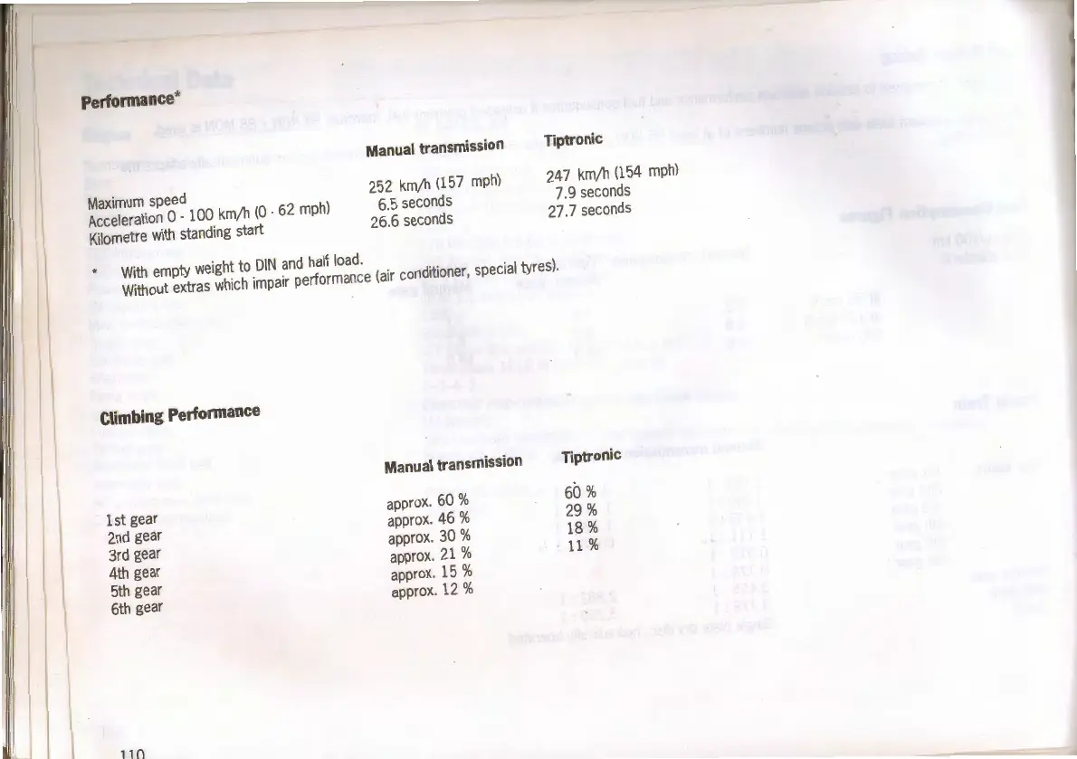 Porsche 968 - Technical Data: Performance; Vehicle Performance Specifications; Climbing Performance by Gear