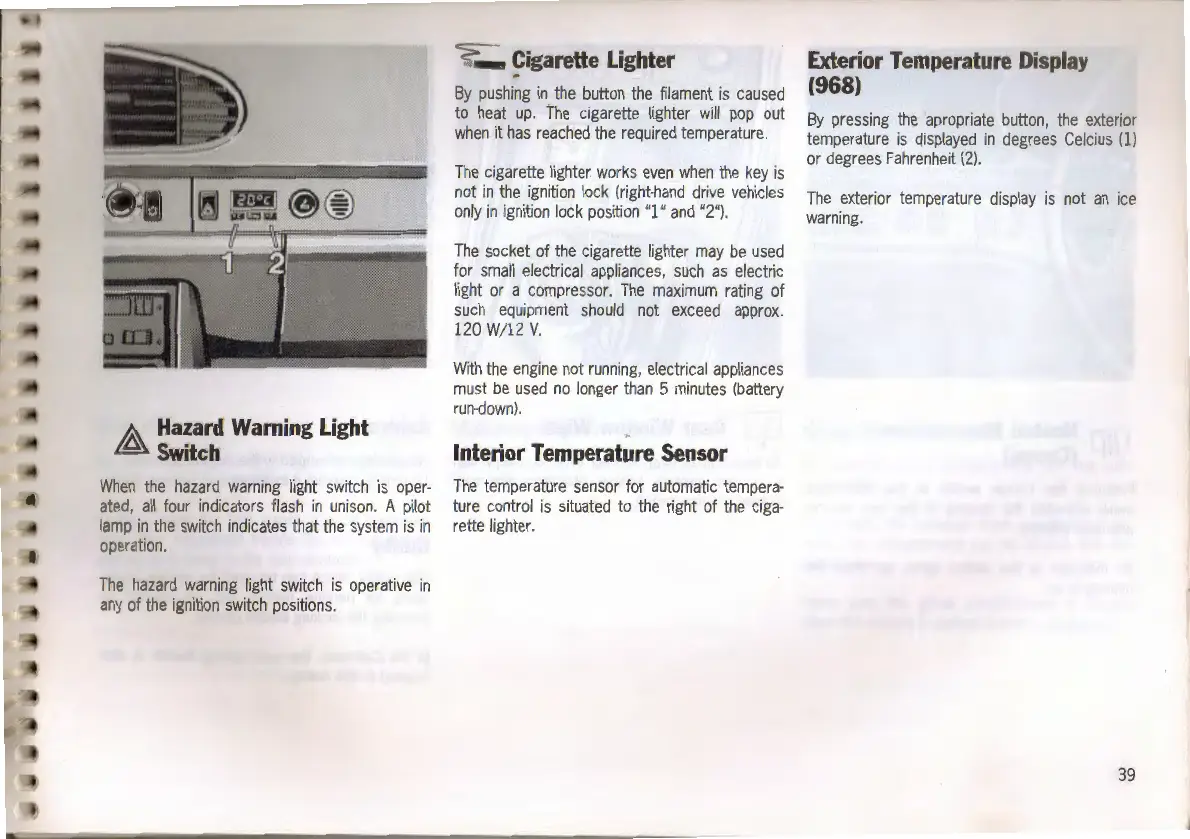 Porsche 968 - Vehicle Controls and Displays; Hazard Warning Light Switch; Cigarette Lighter and Socket; Exterior Temperature Display