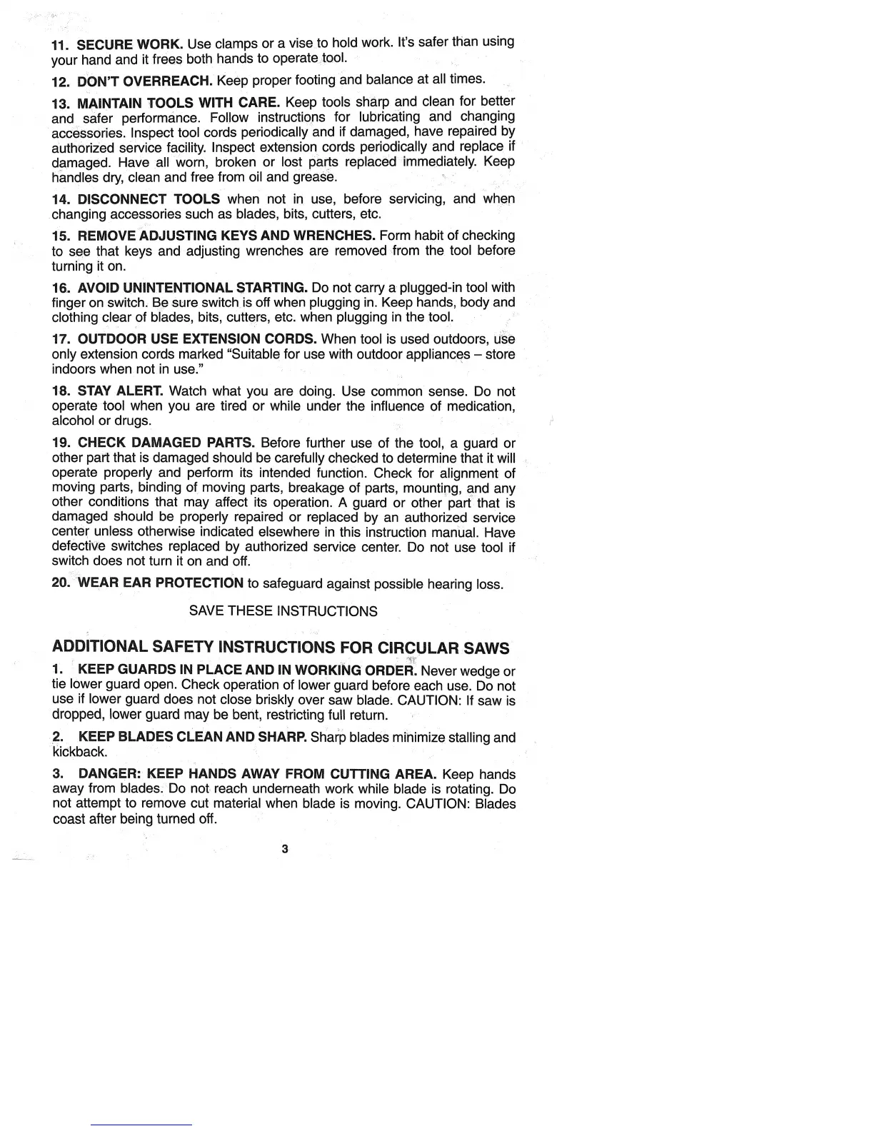 Porter-Cable 315-1 - ADDITIONAL SAFETY INSTRUCTIONS FOR CIRCULAR SAWS