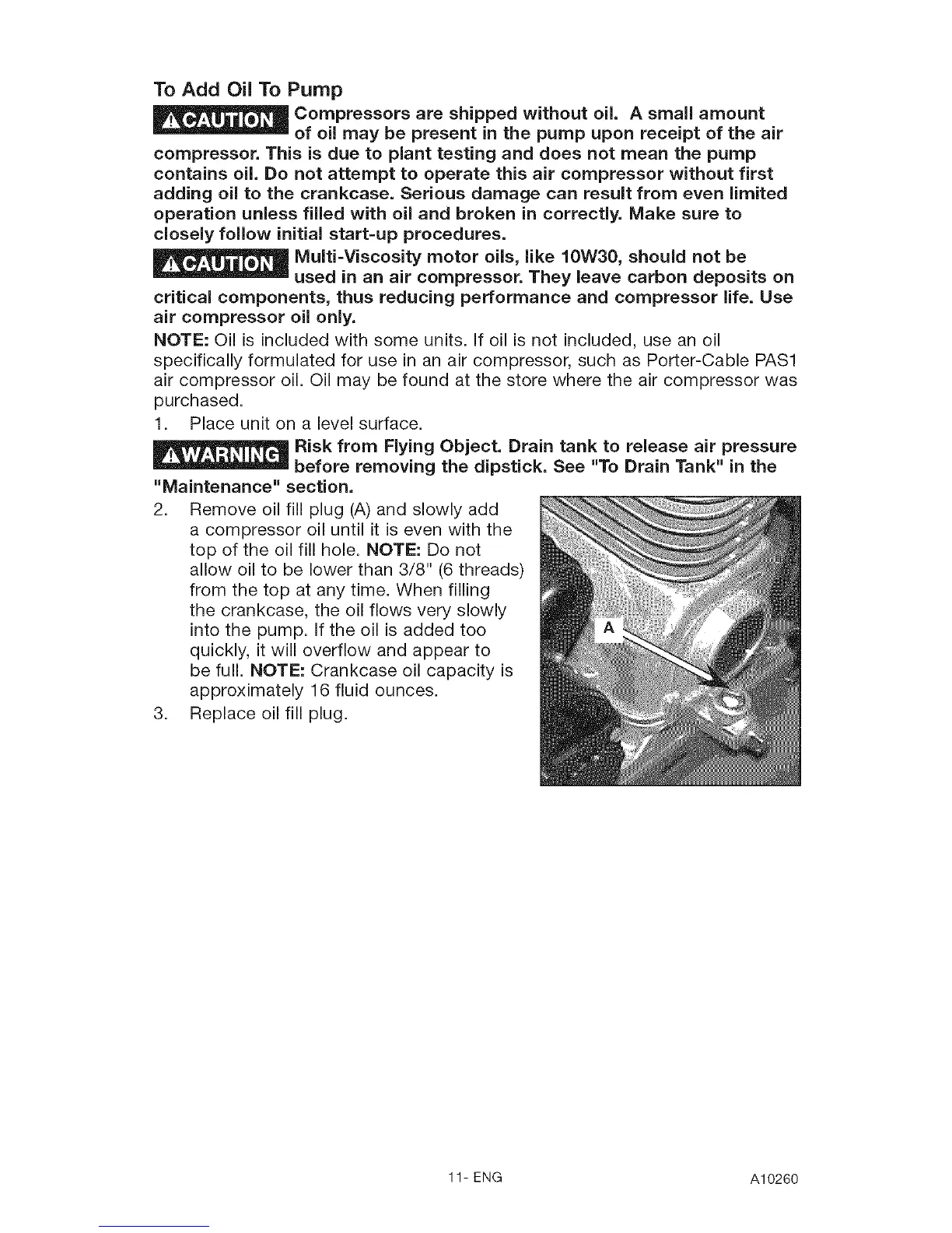 contains oil. Do not attempt to operate this air compressor without first