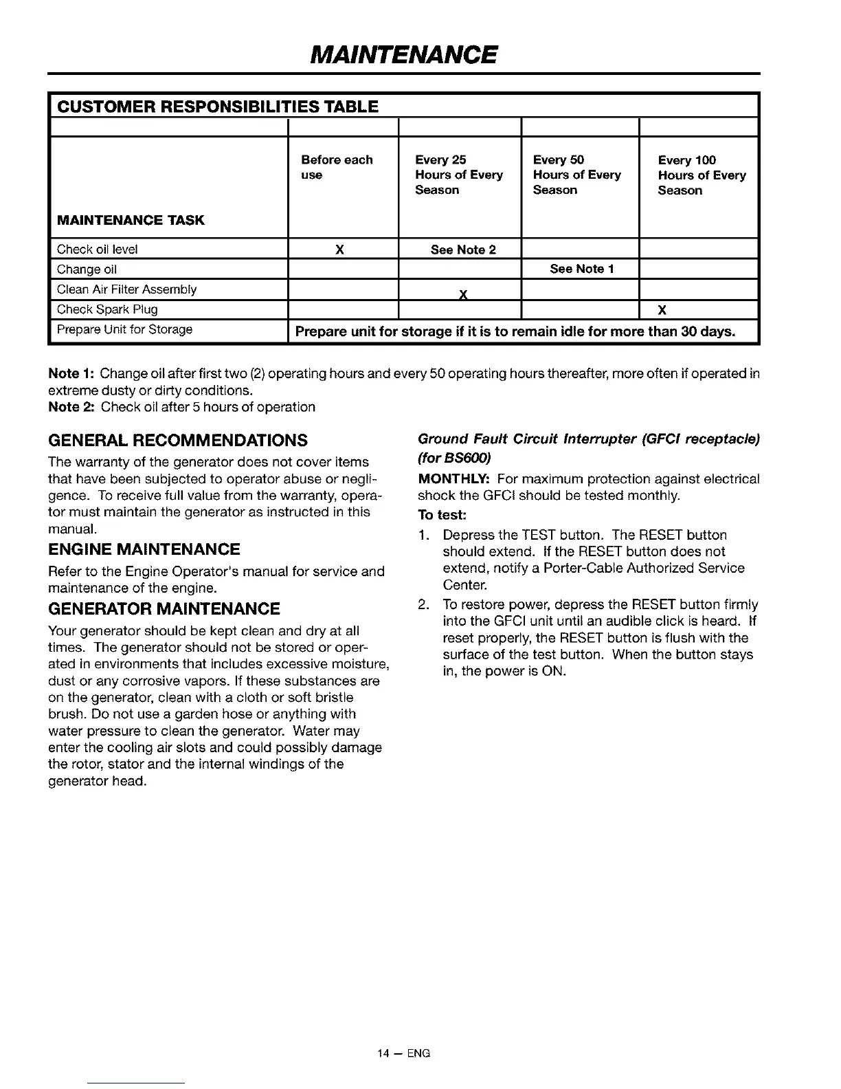 Note 1: Change oil after first two (2) operating hours and every 50 operating hours thereafter, more often if operated in