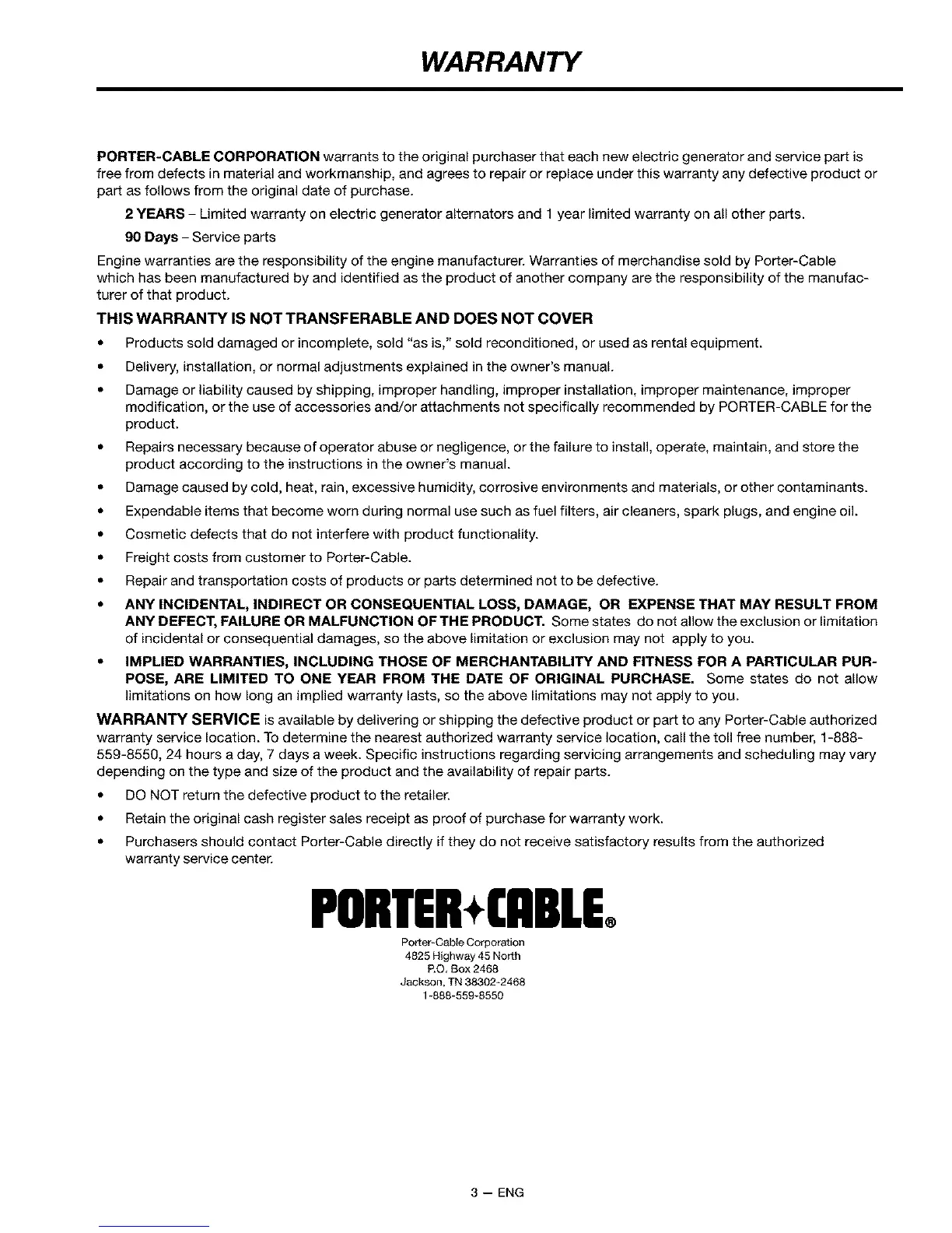 PORTER-CABLE CORPORATION warrants to the original purchaser that each new electric generator and service part is