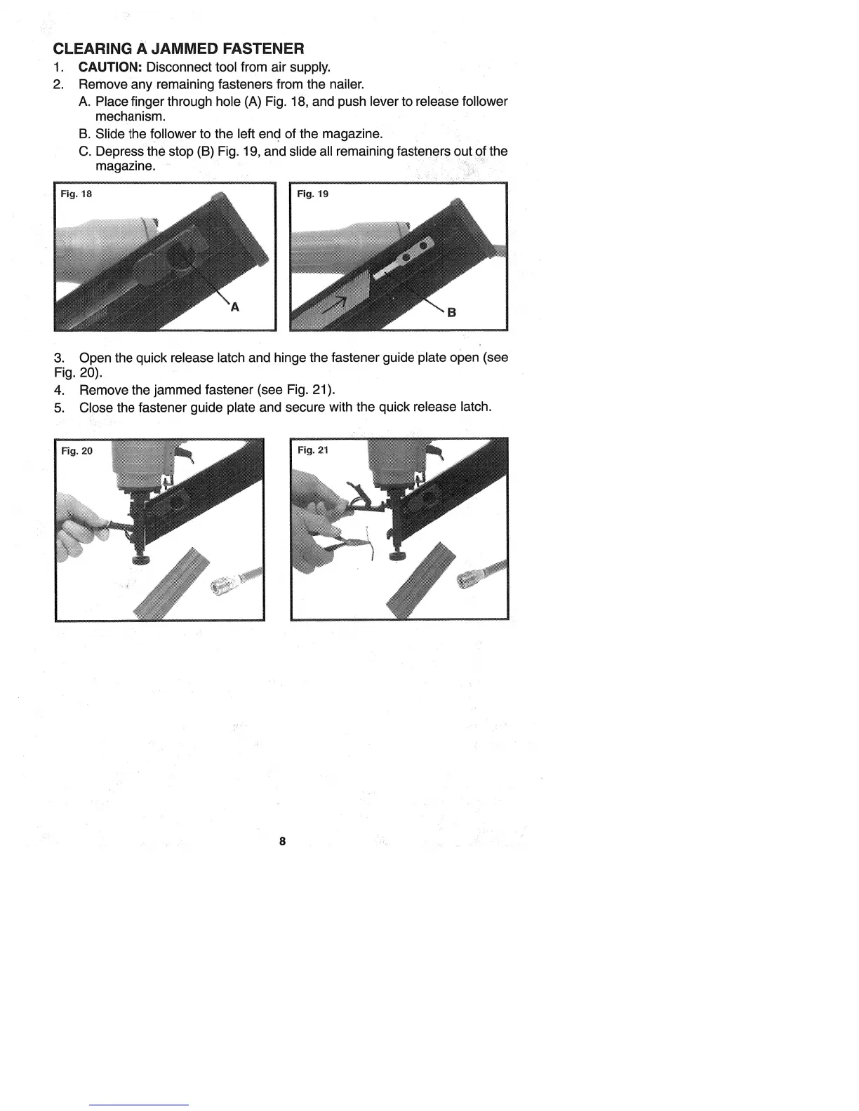Porter-Cable DA250 - Maintenance and Troubleshooting Procedures; Clearing Fastener Jams
