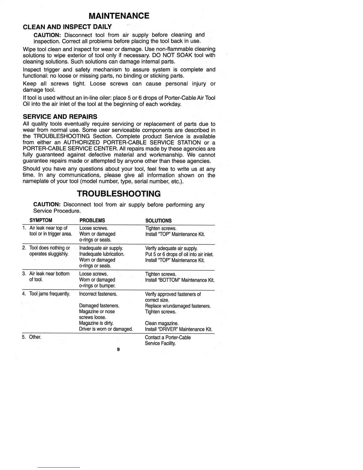 Porter-Cable DA250 - Routine Cleaning and Inspection; Problem Diagnosis and Solutions