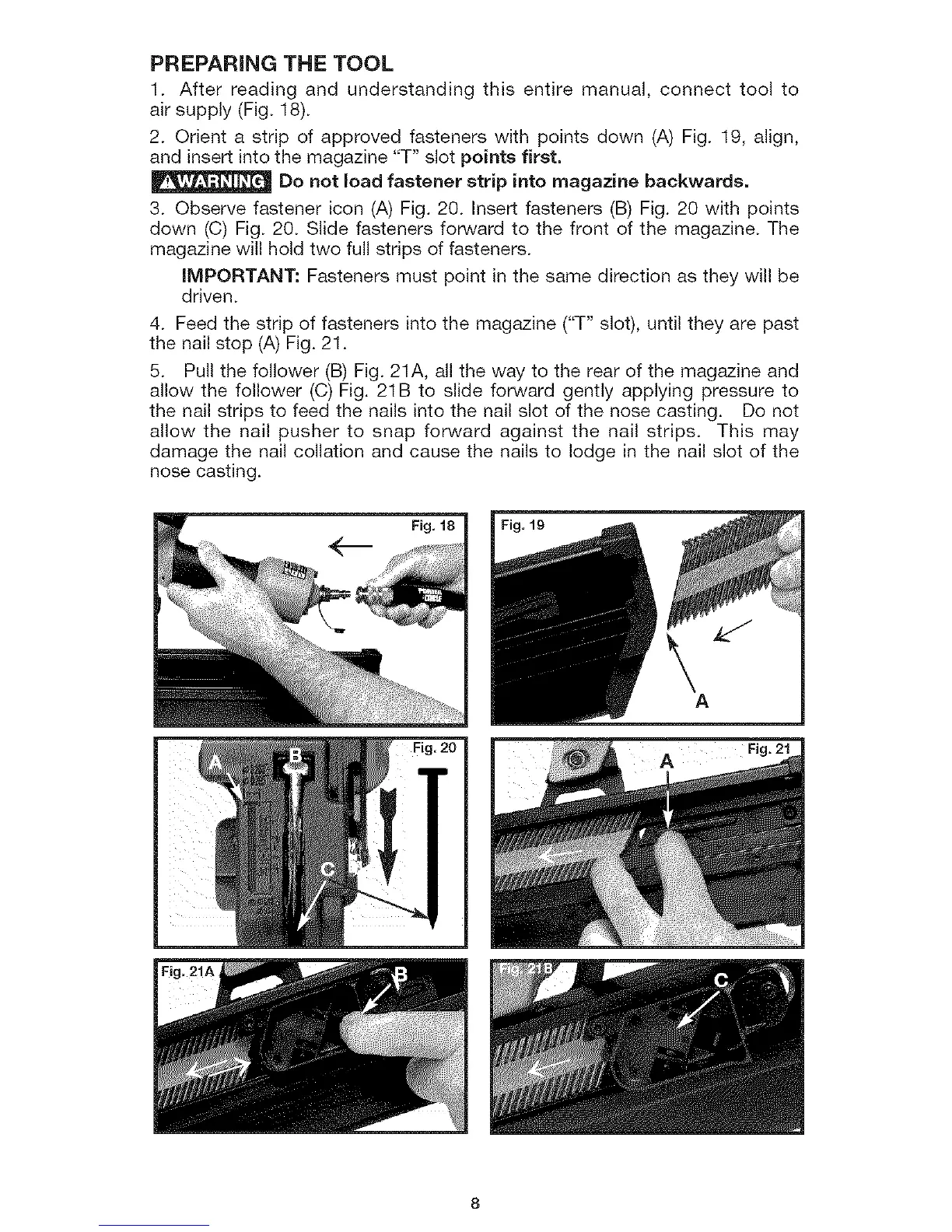 2. Orient a strip of approved fasteners with points down (A) Fig. 19, align,
