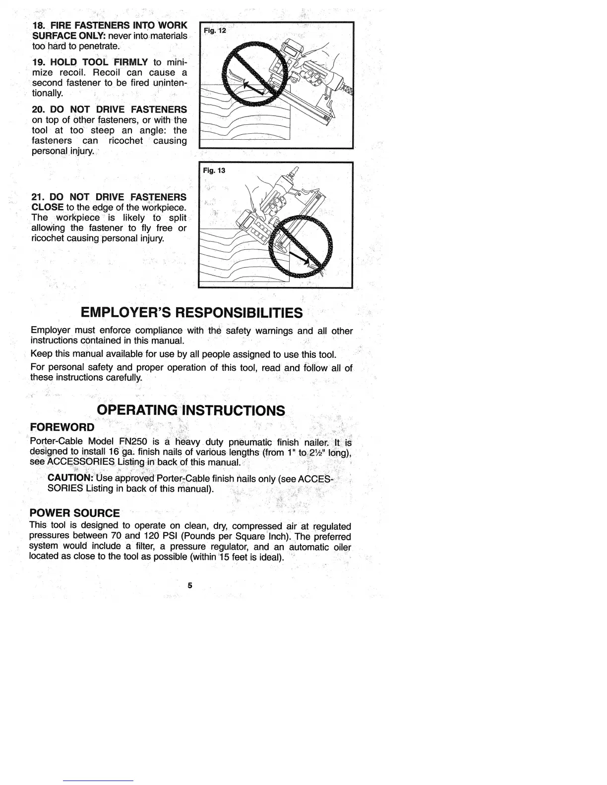 Porter-Cable FN250 - Safe Firing Location; Minimize Recoil; Angle and Fastener Placement; Fastener Placement Near Edge