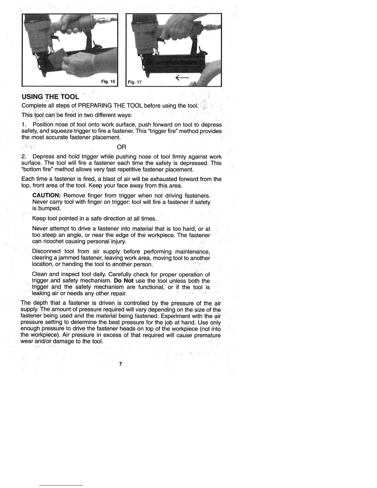 Porter-Cable FN250 - USING THE TOOL; Trigger Fire Operation; Contact Fire Operation; Using Tool Safety Precautions