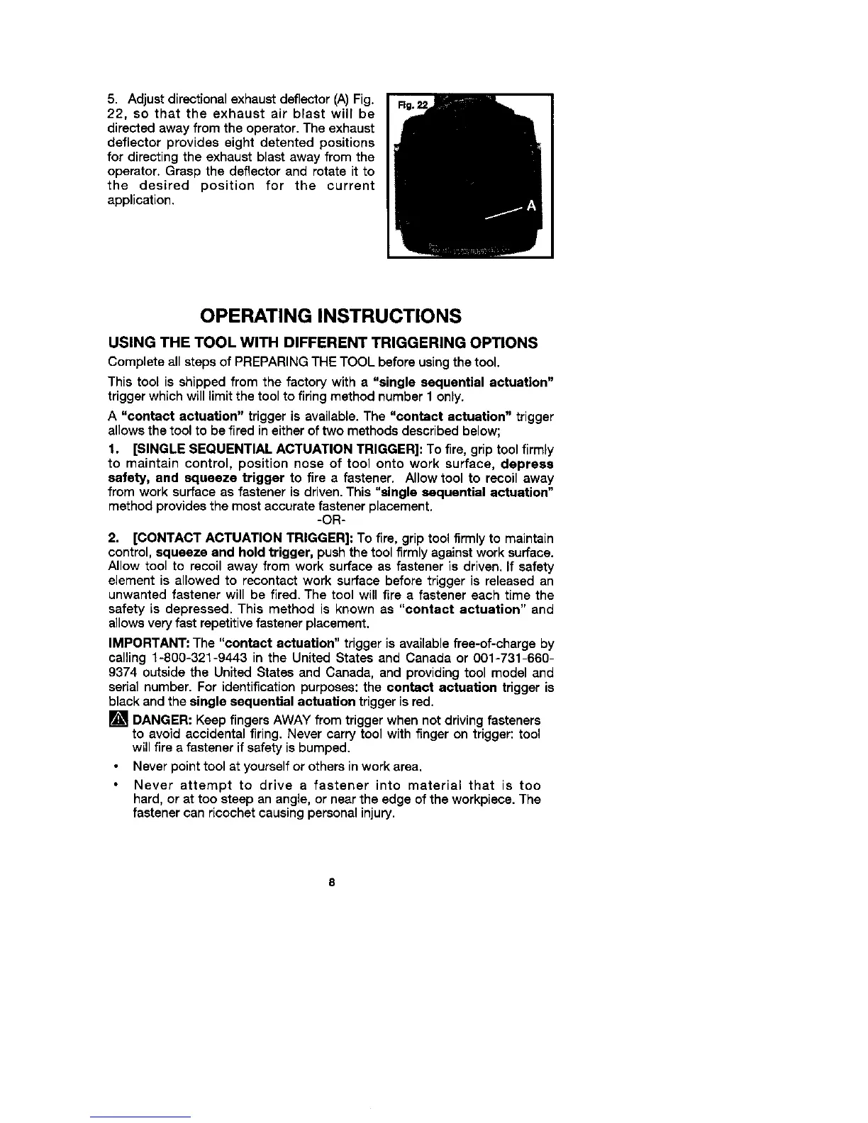 [] DANGER: Keep fingers AWAY from trigger when not driving fasteners