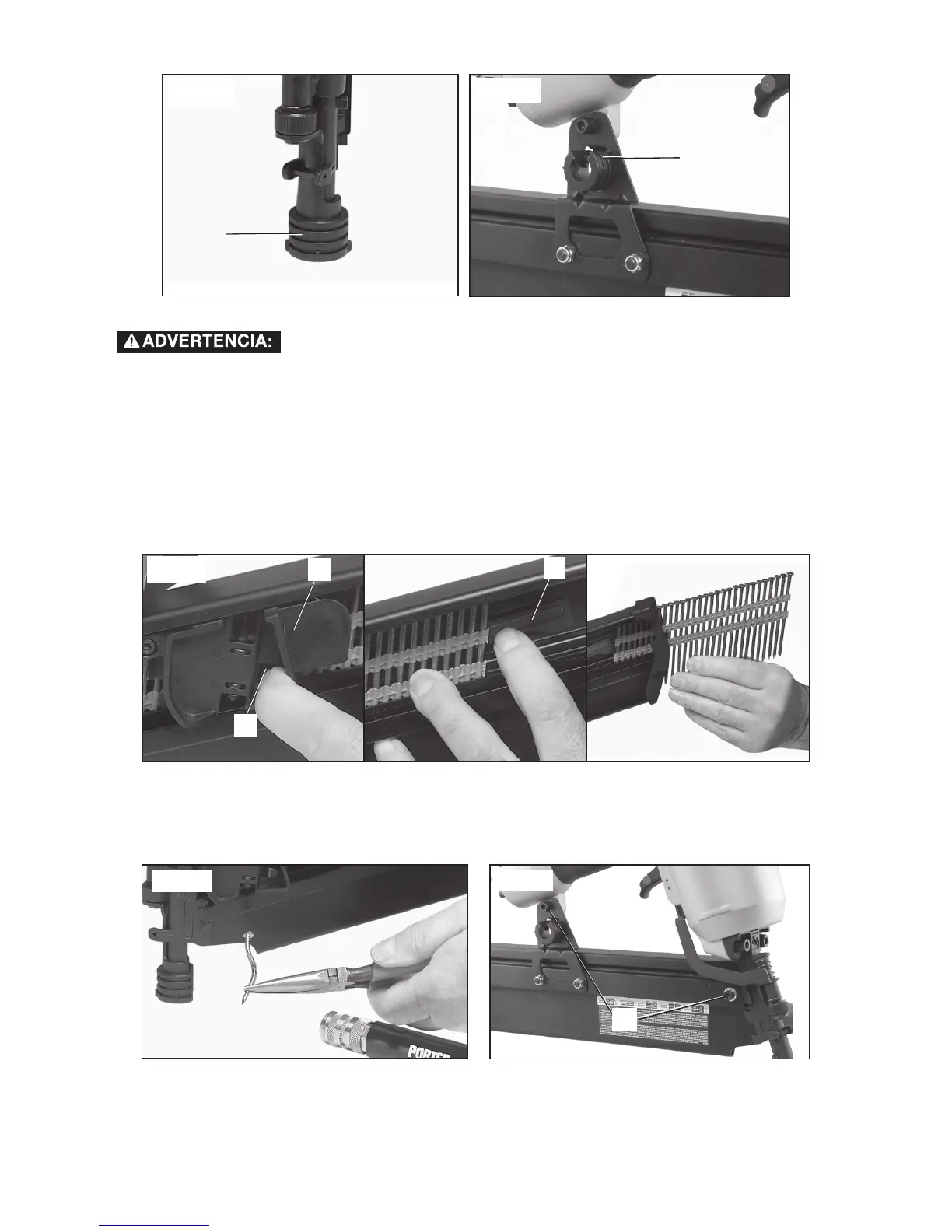 Si un clavo queda atascado en la boquilla, deje la herramienta apuntando hacia el lado