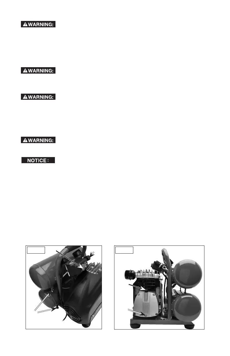 Before starting compressor, pull the ring on the safety valve (F) to make sure that the