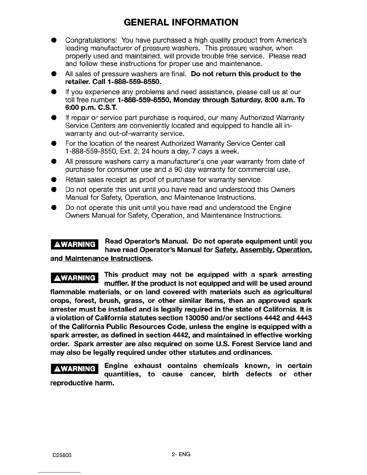 • All pressure washers carry a manufacturer's one year warranty from date of