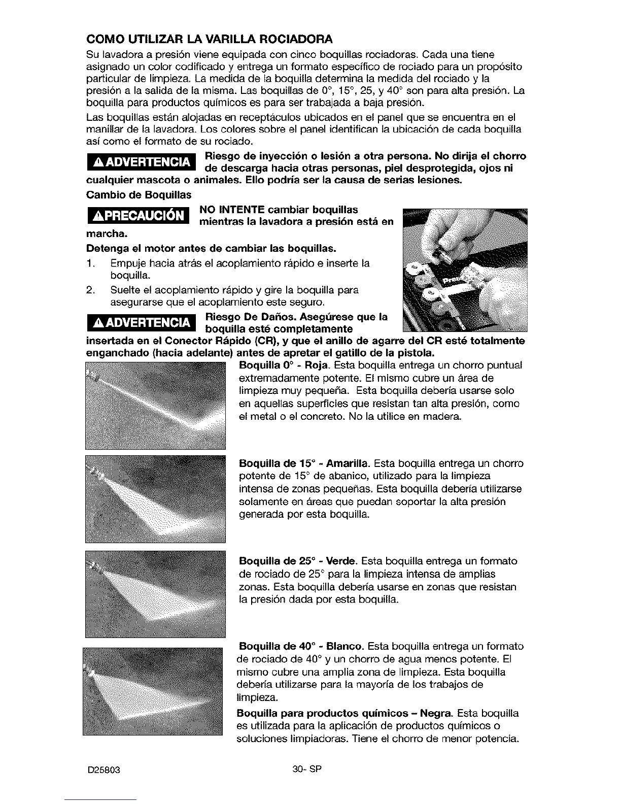Su lavadora a presi6n viene equipada con cinco boquillas rociadoras. Cada una tiene