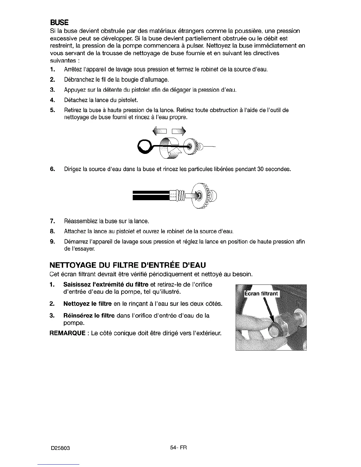 reatreint, la pression de la pompe eommencera & pulser. Nettoyez la buse immediatement en