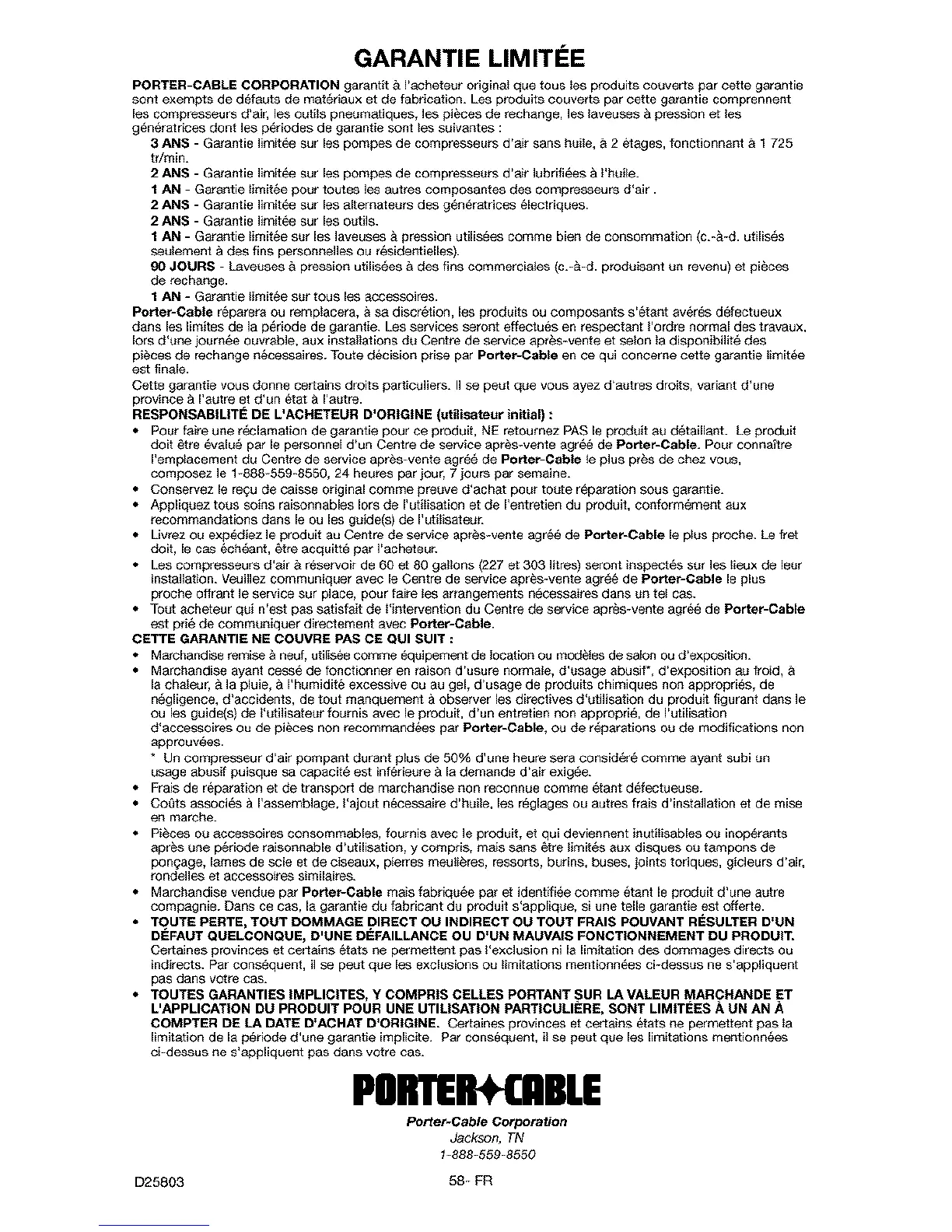 pi_ces de rechange r}_cessaires. Toute d_cisior} prise par Porter-Cable en ce qui concerr}e cette garantie _imit_e